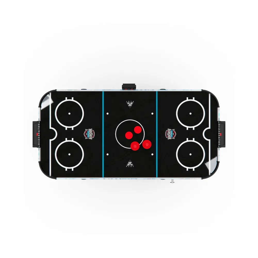 Электронный счетчик на игровом столе облегчает подсчет очков и позволяет следить за ходом игры. В комплекте со столом идут 2 биты и 2 шайбы для начала увлекательной игры.