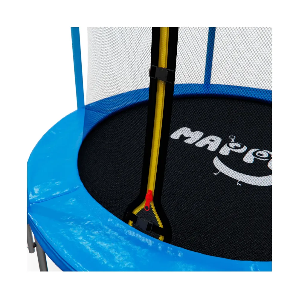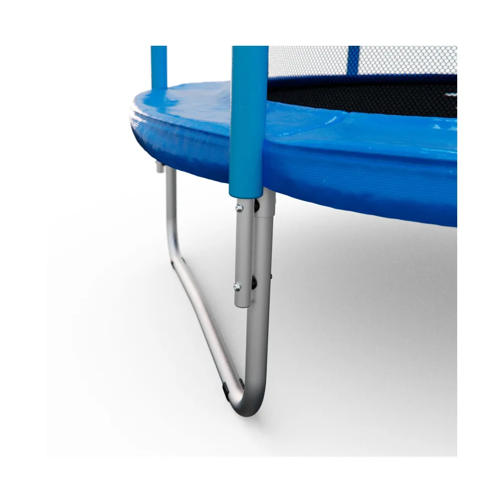Каркас батута изготовлен из прочной стали, что гарантирует его долговечность даже при частом использовании. Прыжковое полотно выполнено из качественного полипропилена, устойчивого к воздействию ультрафиолетовых лучей, что делает его идеальным для открытых пространств.