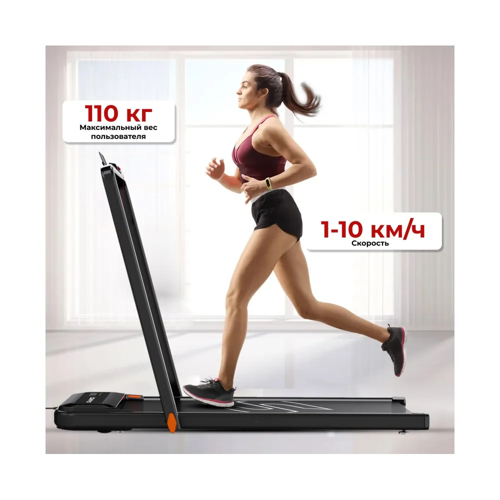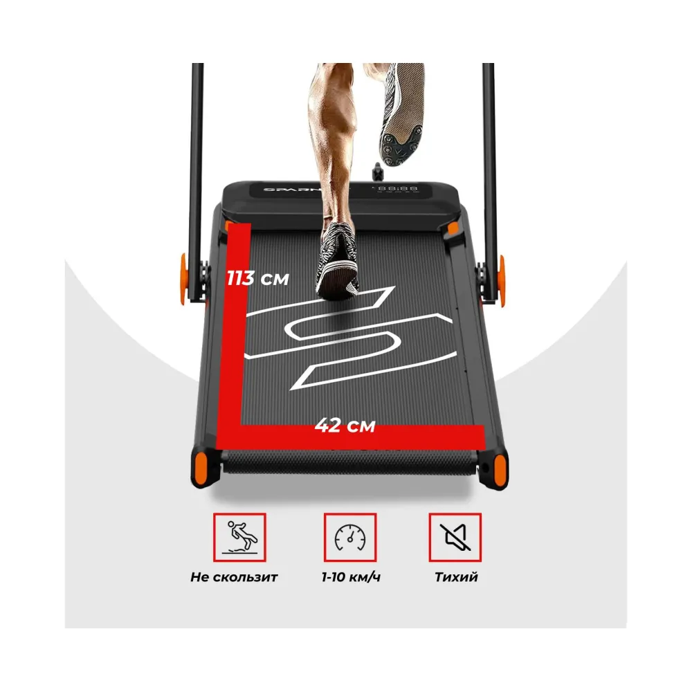 Широкое беговое полотно размером 113 х 42 см обеспечивает комфортный шаг. Система из 8 амортизаторов снижает ударную нагрузку на суставы, что особенно важно для людей с чувствительными суставами или в период реабилитации после травм.