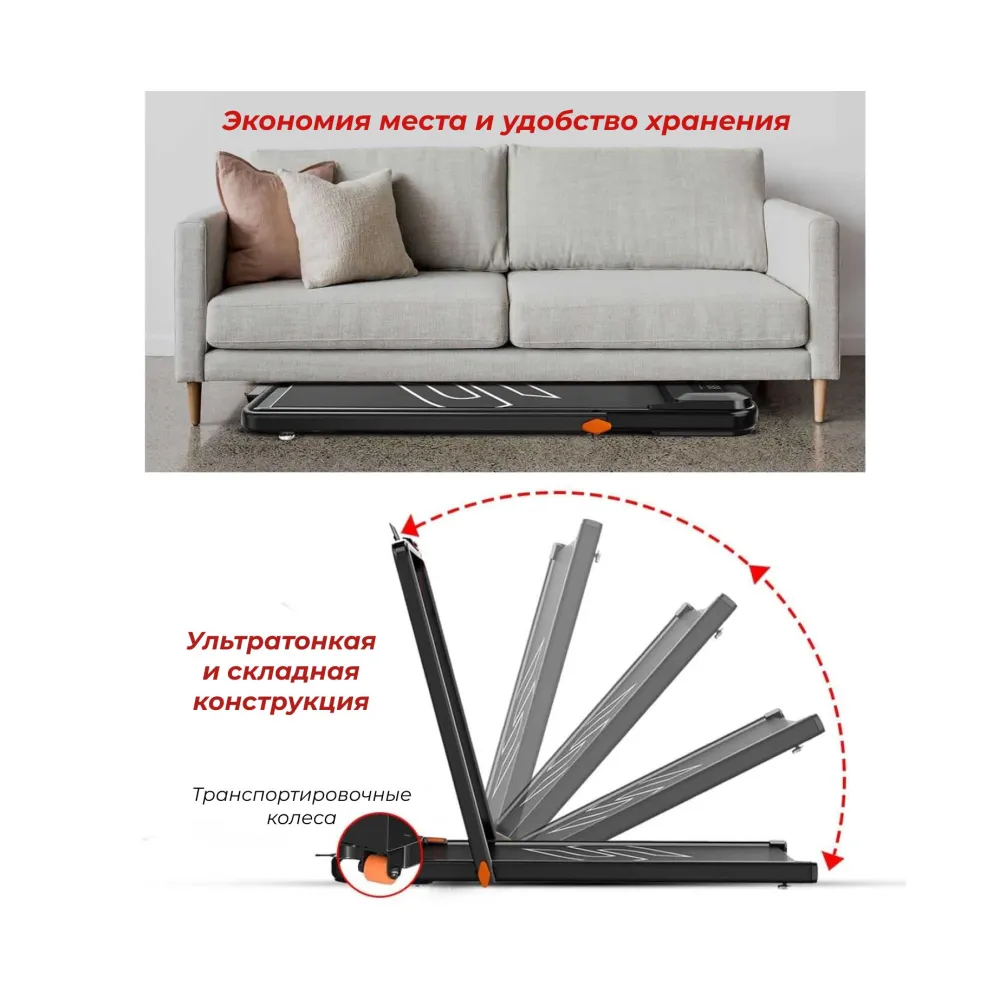 Транспортировочные ролики обеспечивают удобство перемещения дорожки по дому, а её компактные размеры позволяют размещать её даже в ограниченном пространстве. После занятий дорожку можно быстро убрать, освобождая место.