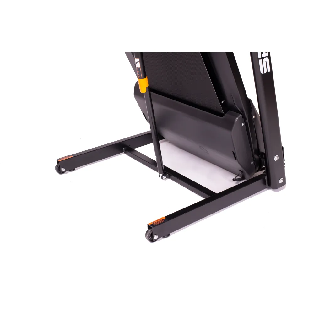 Беговая дорожка легко складывается благодаря двухфазной гидравлической системе, обеспечивающей плавное опускание. Перемещение устройства удобно благодаря двум транспортировочным роликам. В дополнение предусмотрена подставка для телефона или планшета, что добавляет удобства пользователю.