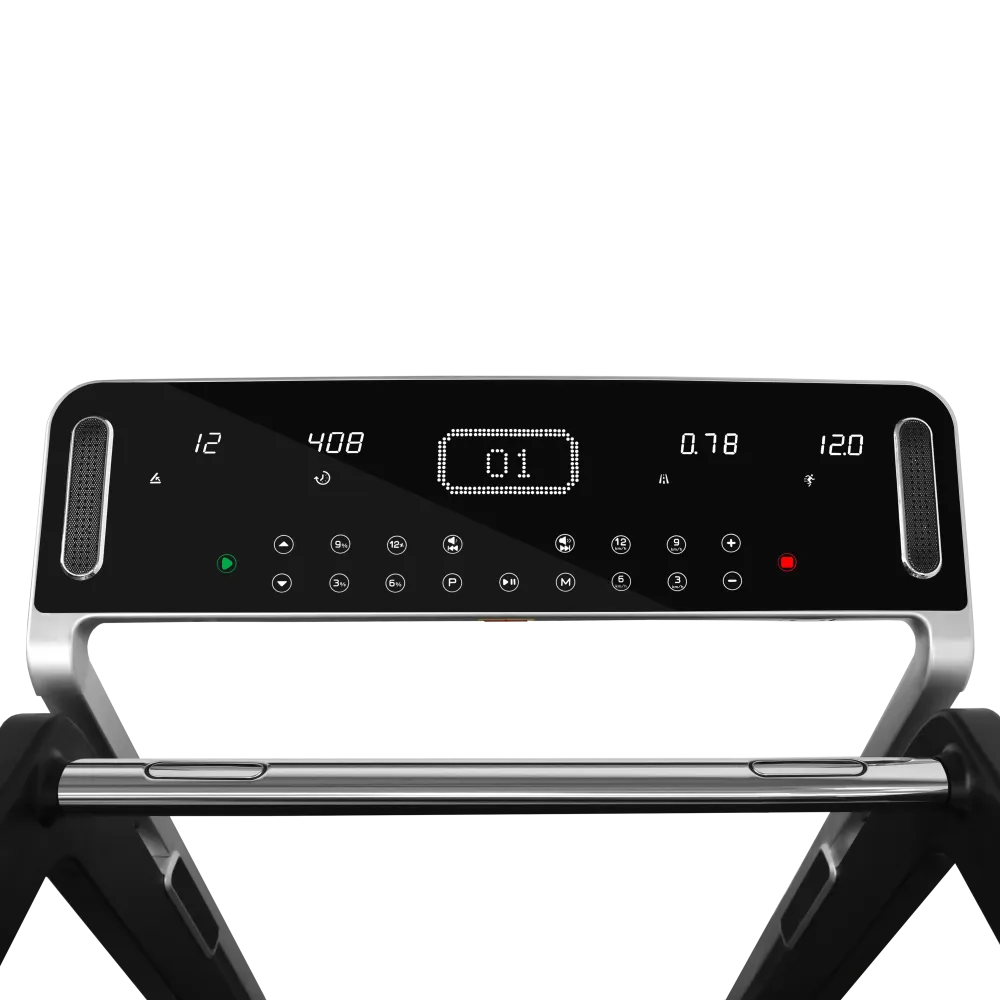Особое внимание на GO T66 уделено консоли. В отличие от большинства других беговых дорожек, здесь используется небольшая тонкая прямоугольная консоль, покрытая черным глянцем. Тренировочный компьютер представлен профессиональным LED дисплеем и 4 дополнительными буквенно-цифровыми LCD экранами. Абсолютно все клавиши управления сенсорные и подсвечены внутренними светодиодами. Когда дорожка выключена, ее консоль представляет собой стильный черный экран. Встроенные программы ориентированы на любые возможные задачи - снижение веса, тренировку выносливости или скоростных качеств. Помимо этого, есть 3 пульсозависимые и 3 пользовательские программы. Для точного определения пульса и просто комфортной тренировки в компьютер встроен высокоточный беспроводной телеметрический приемник (для считывания частоты сердечного ритма рекомендован нагрудный ремень-передатчик Polar T34). GO T66 синхронизируется с мобильным приложением FitShow . Большой выбор уникальных программ, анализ статистических данных, функция регулировки скорости и угла наклона на мобильном телефоне помогут пользователям повысить эффективность занятий спортом.