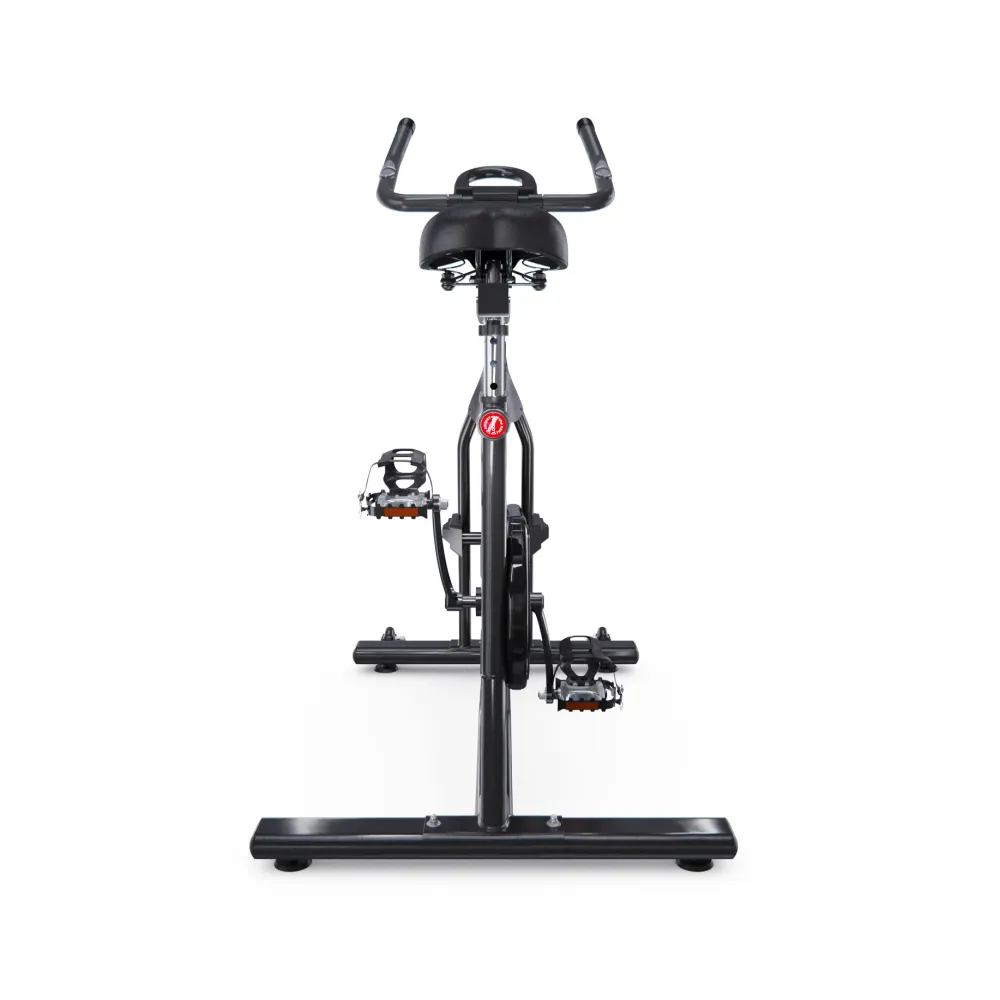 Спин-байк CHAOKE чёрного цвета удобнее и тише других. Прочная стальная рама и алюминиевый маховик весом 19 килограмм обеспечивают устойчивость во время езды на велосипеде. Он выдерживает нагрузку до 150 кг и подходит для пользователей ростом от 146 до 198 см.