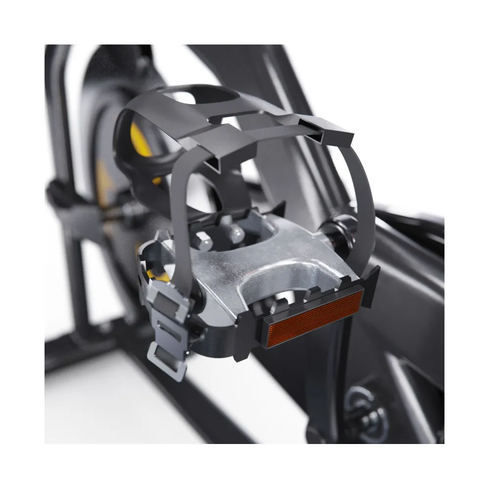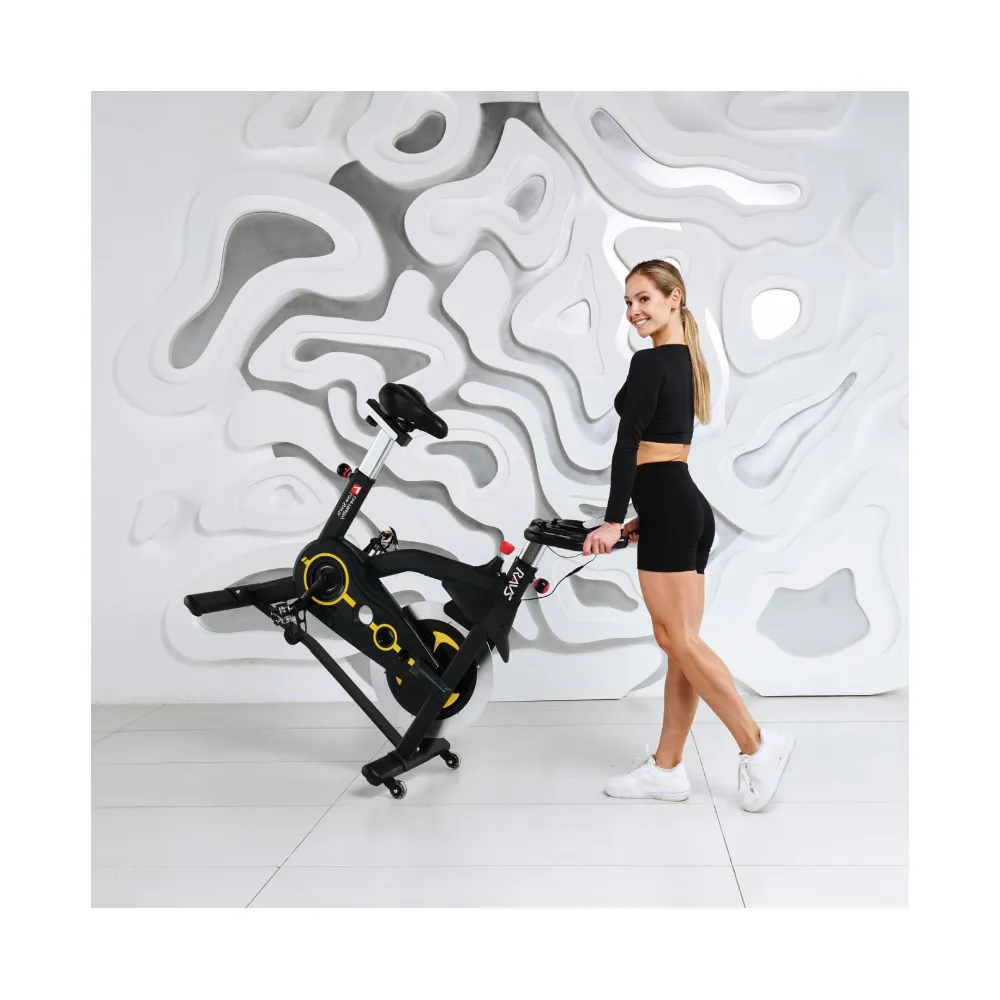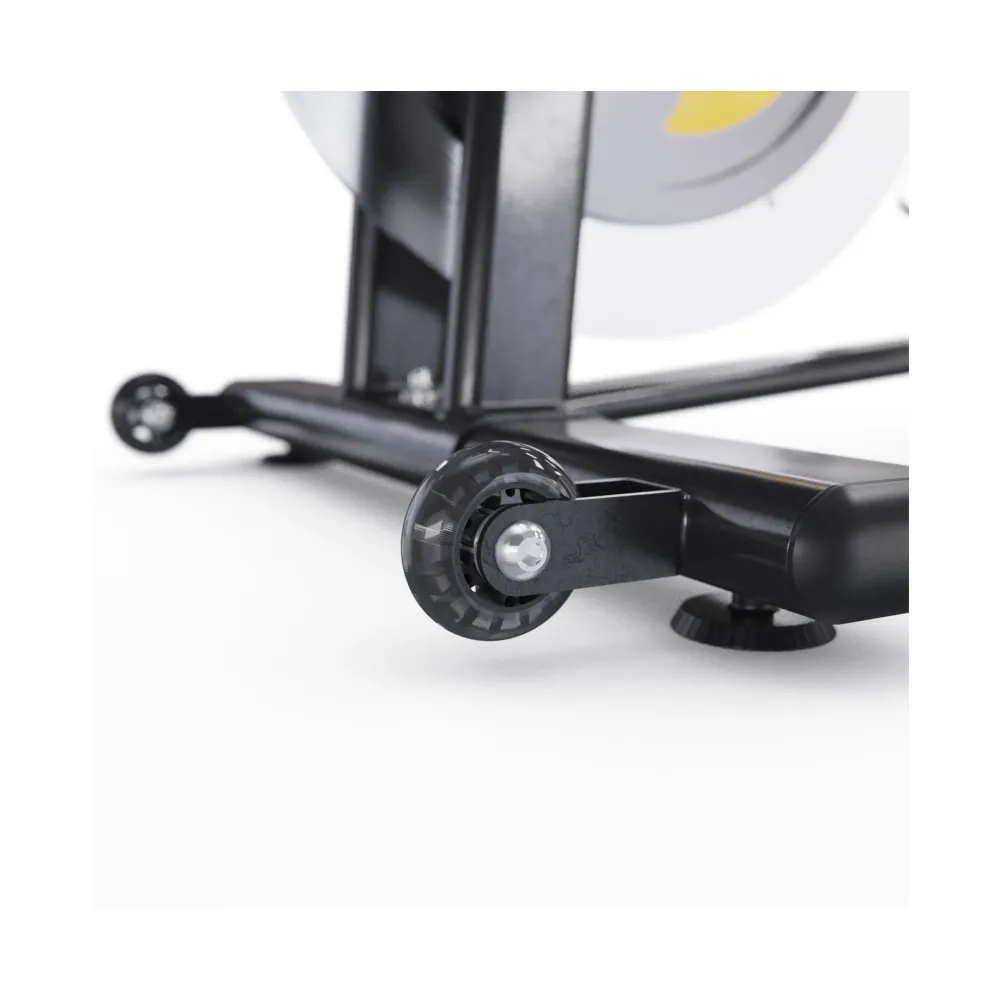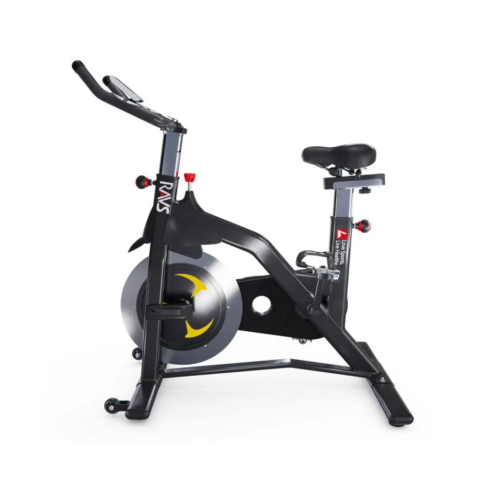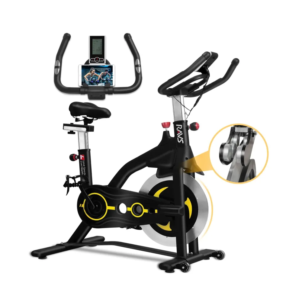 Спин-байк RAVS чёрного цвета имеет прочную стальную раму, что повышает его устойчивость и обеспечивает быструю езду. Он также оснащен большим алюминиевым маховиком с инерционным весом 19 кг, который обеспечивает дополнительный импульс и реалистичные ощущения от езды с препятствиями. Максимальный вес пользователя до 150 кг.
