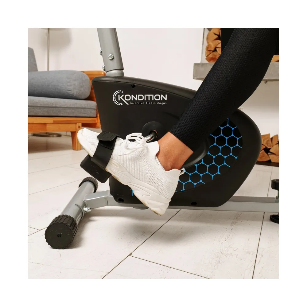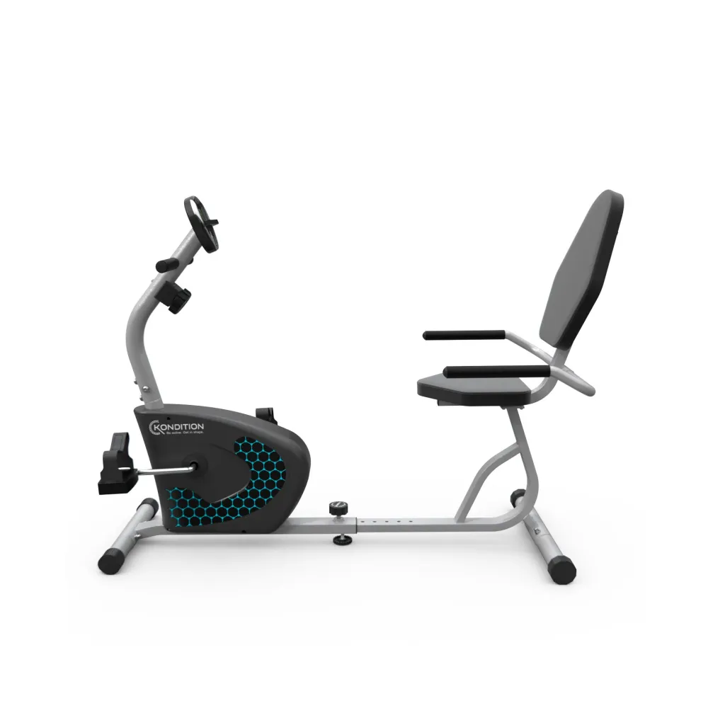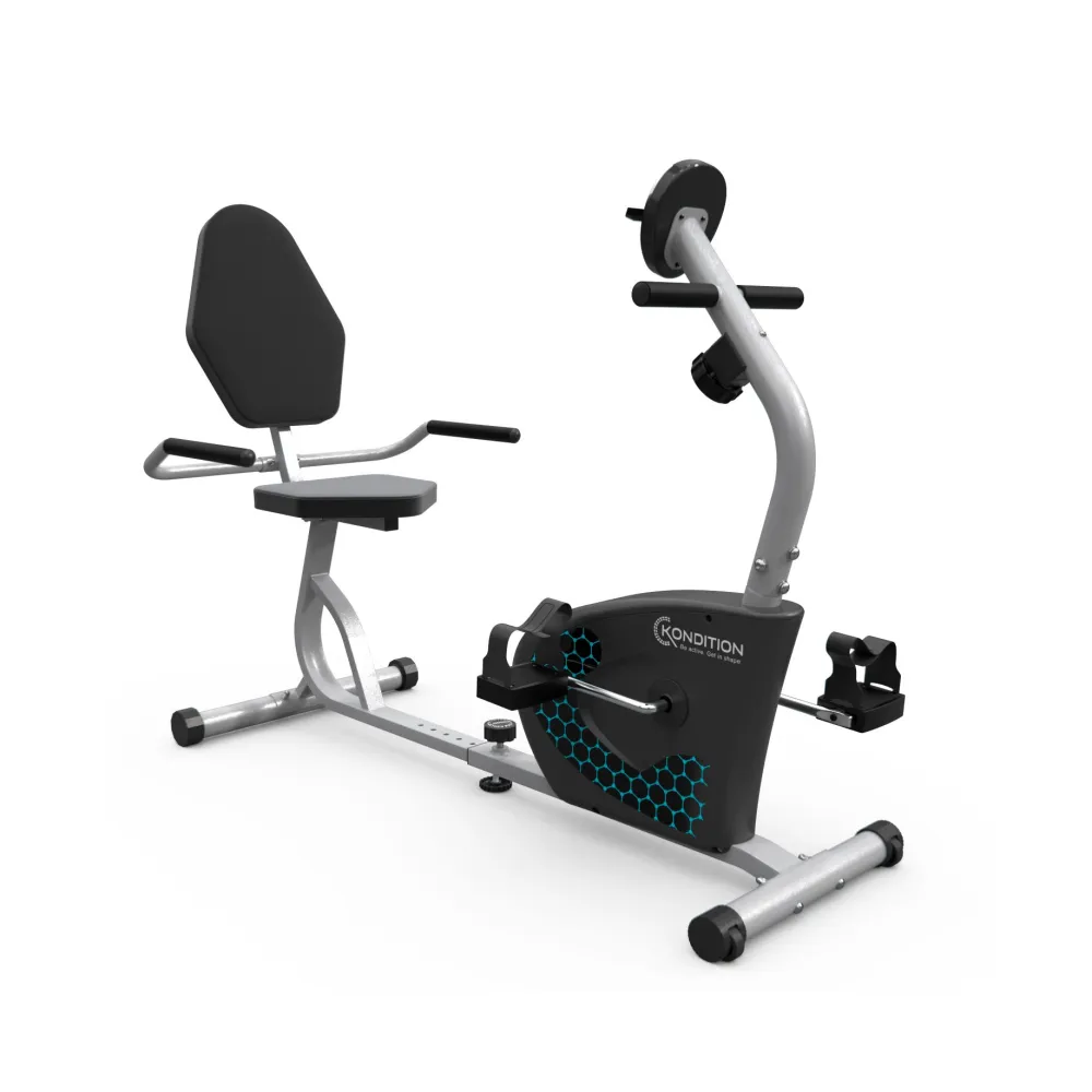 Горизонтальный велотренажёр Kondition предназначен для поддержания физической формы и улучшения здоровья. Максимальный вес пользователя 100 кг.