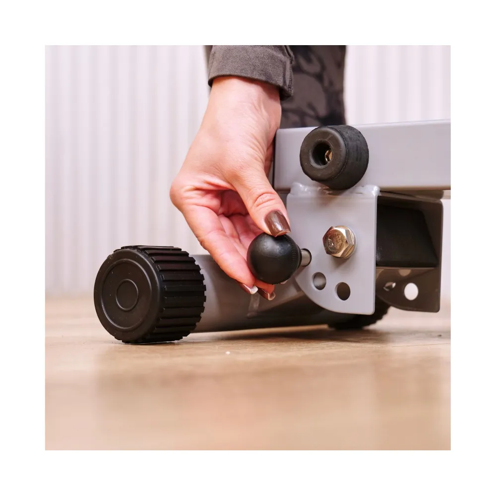 Гребной тренажёр DFC R403B2 — это не только эффективный кардиотренажёр для укрепления сердечно-сосудистой системы, но и универсальный инструмент для развития мышц ног и рук. Благодаря механической регулировке угла наклона рамы и гидравлической системе нагрузки, вы сможете настроить оптимальные условия для кардио занятий и повысить их эффективность.