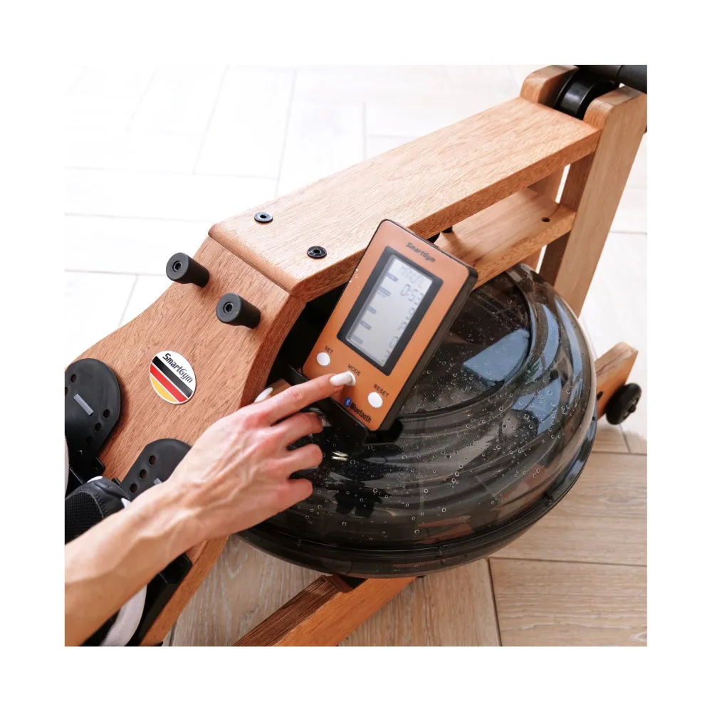 Консоль гребного тренажёра SmartGym имеет 8 уровней регулировки педалей и показывает время, расстояние, калории, пульс и обороты в минуту. Система нагрузки является водной: чем больше вы зальёте в бак воды, тем больше будет нагрузка. Транспортировочные ролики позволяют легко перемещать тренажёр, а его размер в сложенном виде составляет 60 x 56,5 x 210 см.