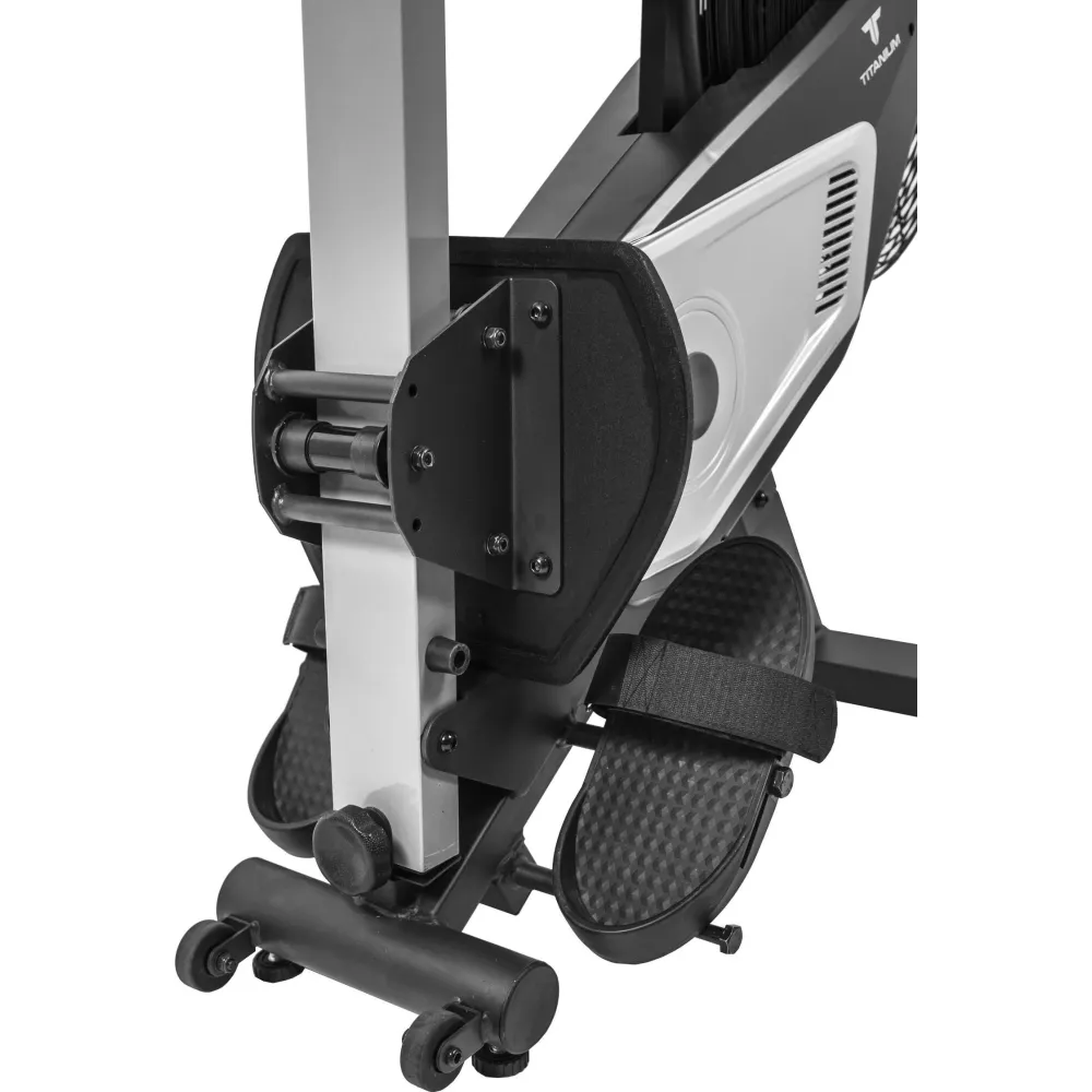 Гребной тренажер TITANIUM SF 0474 с воздушным сопротивлением отлично имитирует греблю на лодке. Во время тренировки маховик создает поток воздуха, и чем быстрее вы гребете, тем больше сопротивления. Маховик движется плавно, без рывков, а комфортное сиденье скользит тихо, что создает удобные условия для занятий.