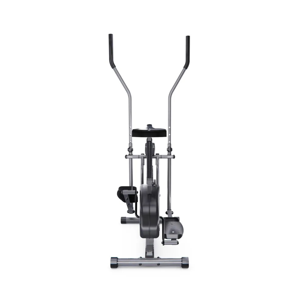 Этот тренажёр оснащён передним маховиком, что обеспечивает плавный и тихий ход. Благодаря двум положениям поручней (свободное и статичное) и регулировке на 4 уровня по высоте, вы сможете настроить тренажёр под себя. В свободном положении поручней тренажёр работает как эллиптический, а в статичном — как велотренажёр.