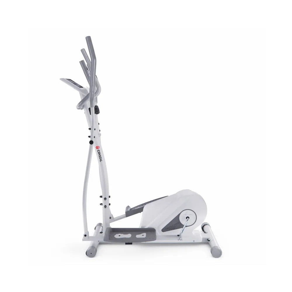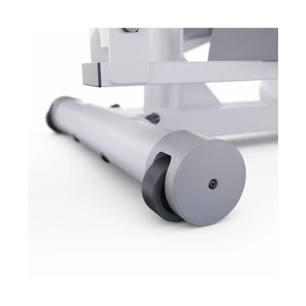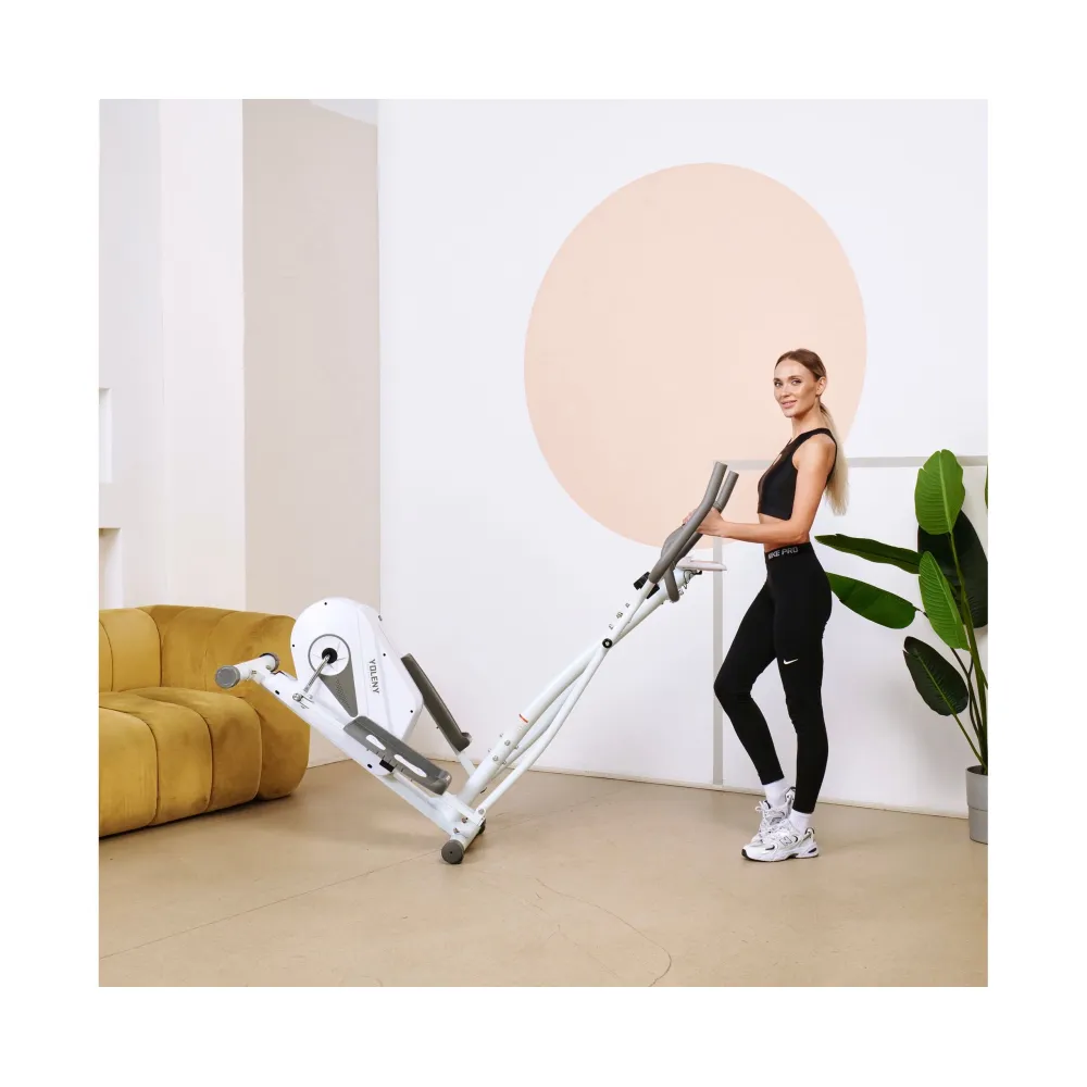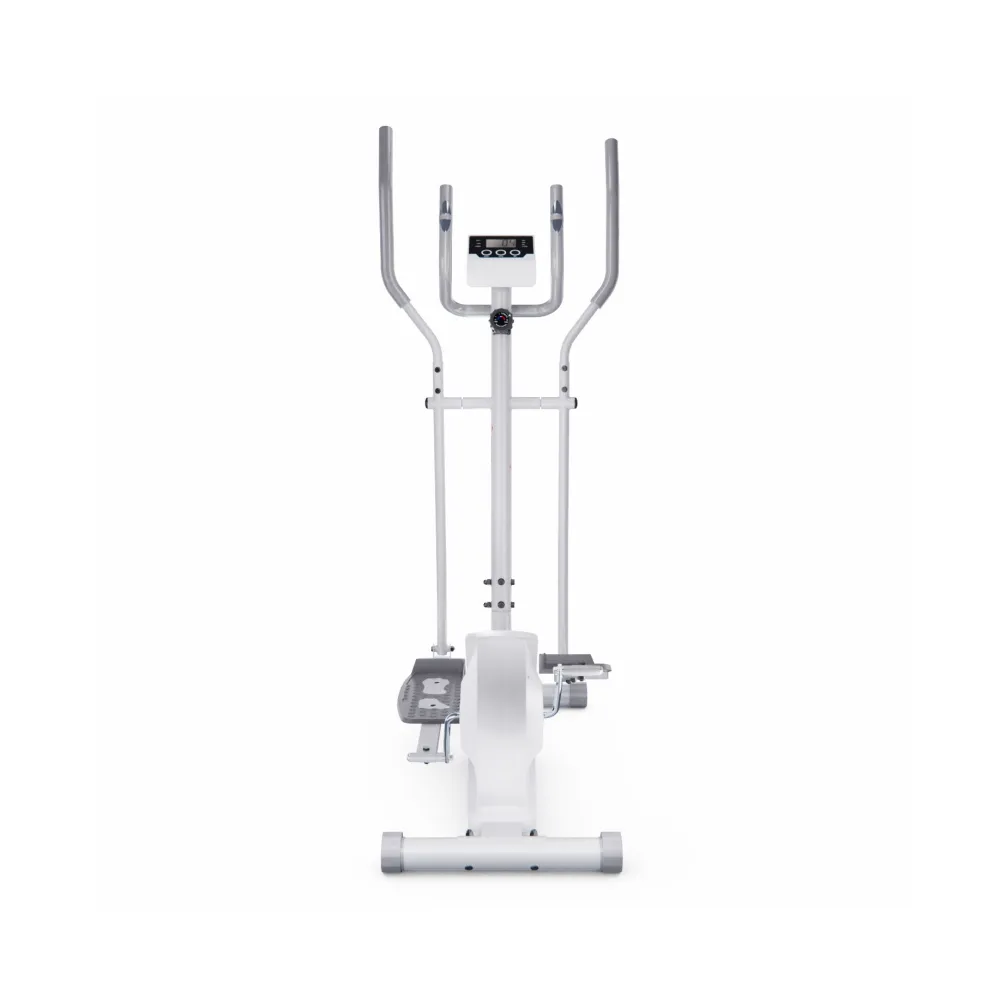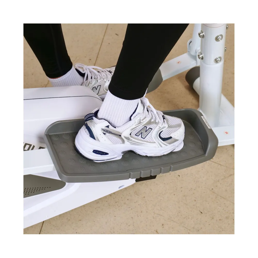 Длина шага составляет 36 см, а расстояние между педалями — 20 см, что обеспечивает комфорт и безопасность во время занятий. Транспортировочные ролики и компенсаторы неровности пола делают тренажёр мобильным и устойчивым.