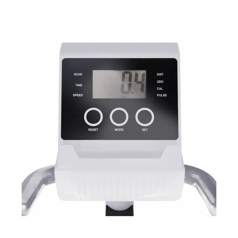 Консоль тренажёра оснащена монохромным LCD-дисплеем, который показывает скан, время, расстояние, калории, скорость, пульс и общую дистанцию. Сенсорные датчики на поручнях позволяют контролировать пульс во время тренировки. Консоль работает от двух батареек типа AA, которые не входят в комплект поставки.