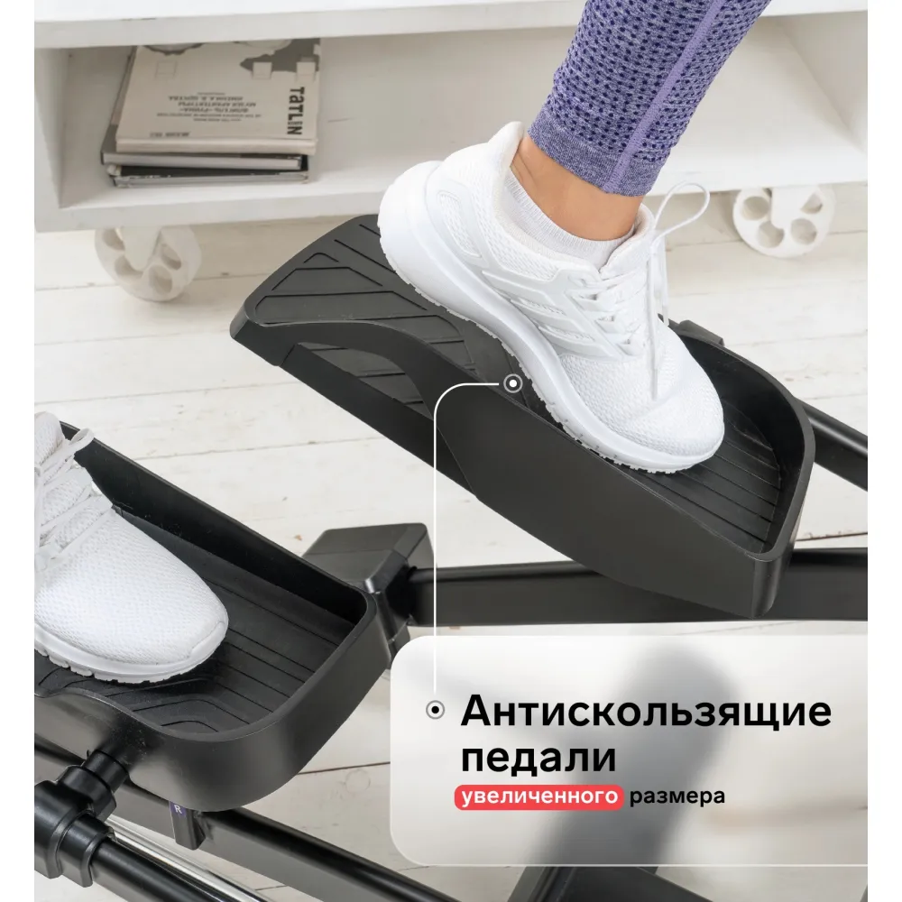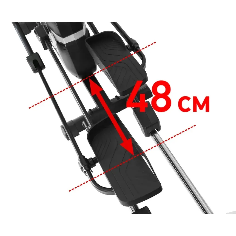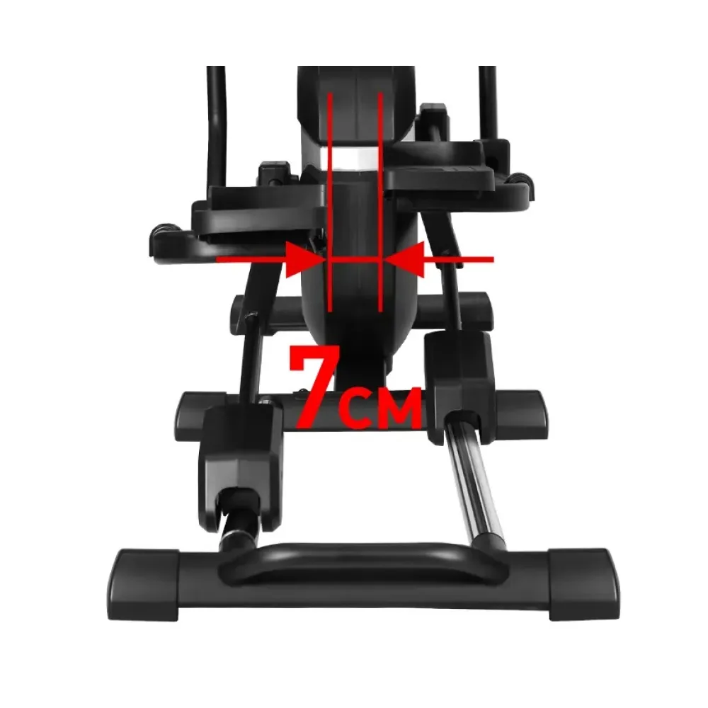 SVENSSON BODY LABS FRONTLINE RTA относится к классу электромагнитных эллиптических эргометров с переднерасположенным приводом. Расположенный спереди маховик позволяет значительно лучше настроить общую траекторию движения, уменьшить расстояние между педалями и проще добиться увеличения длины шага. В конечном счете, пользователь получает действительно эффективную и щадящую для суставов тренировку, в то время как эллипсы с заднерасположенным маховиком грешат недостаточной расфокусированной нагрузкой на мышцы бедер и ног и, наоборот, излишним давлением на колени. Если говорить о принципиальном отличии переднего привода от заднего, то это, в первую очередь, расстояние между педалями. У эллипсоида FRONTLINE RTA такое расстояние составляет 7 см. Как известно, во время ходьбы расстояние между стопами обычно составляет 12-15 см, уменьшаясь во время бега до 8-10 см. Поскольку эллиптические тренажеры берут за основу беговые движения, расстояние между педалями также должно быть как можно меньше. Поэтому конструкция рамы и педального узла FRONTLINE RTA обеспечивает минимальное расстояние между педалями (супермалый Q-фактор E.S.Q.F.). Таким образом, вектор силы находится под 90 градусов по отношению к осям - это оптимальное положение с точки зрения эффективности и безопасности тренировки. Безусловно, одним из важнейших биомеханических параметров является также длина шага - для FRONTLINE RTA она составляет оптимальные 48 см.