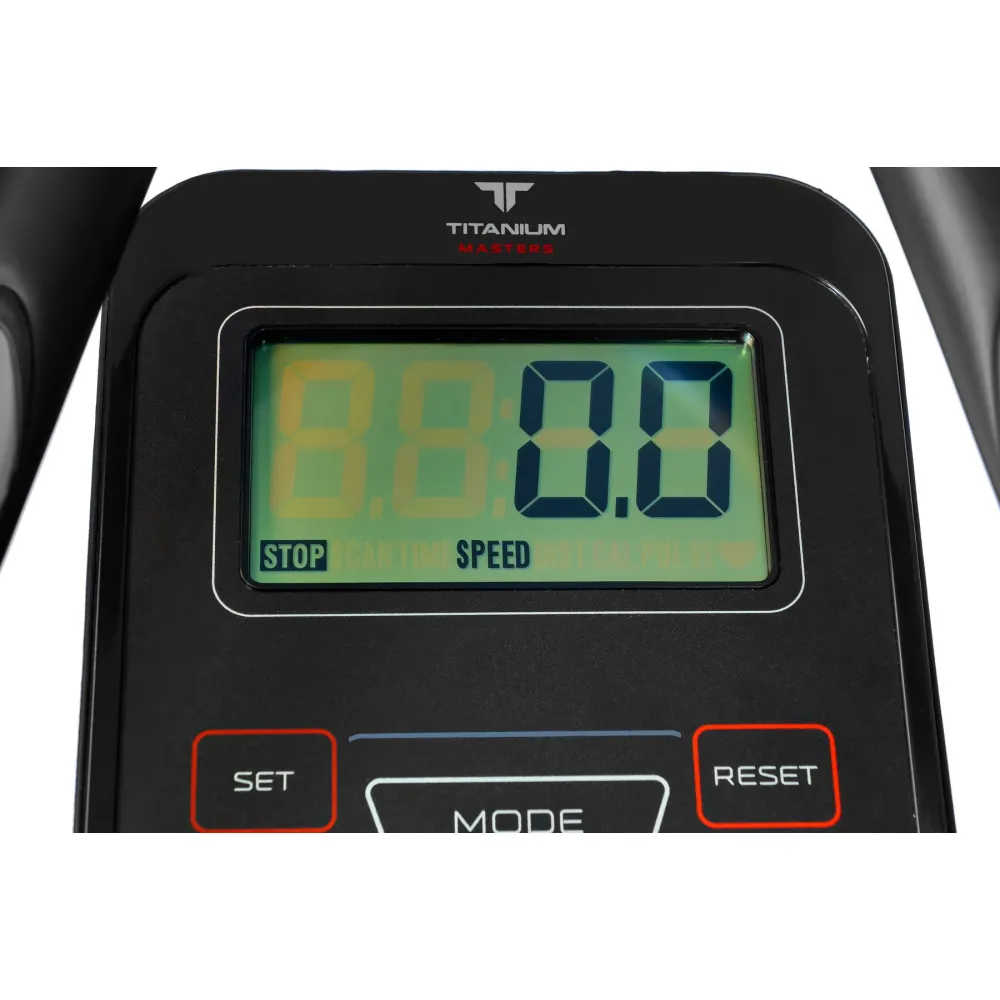 Эллиптические тренажеры от немецкого бренда Titanium – это высокотехнологичное сочетание качества, функционала и дизайна. Разработка продукции происходит в главном офисе компании в Гендельберге, где осуществляется инжиниринг и биомеханическое тестирование. Дизайны тренажеров созданы с акцентом на простоту и удобство использования, при этом вся продукция выполнена с вниманием к деталям, что является отличительной чертой немецкого подхода. Titanium Masters Orbitech XCM – это высокотехнологичный среднеразмерный эллиптический тренажер с задним приводом. Он построен на биовекторной платформе bioTECH™, которая обеспечивает длину шага 40 см и малый Q-фактор 17 см, что снижает нагрузку на суставы. Плавность движения гарантируется магнитной системой magneTECH™, работающей в сочетании с маховиком весом 9 кг. Тренажер устойчив благодаря трехпозиционным педалям увеличенного размера и удобным поручням для людей разной роста и комплекции. Рама выполнена из усиленного стального профиля и выдерживает пользователей весом до 130 кг. Тренировочный компьютер с черно-белым LCD-дисплеем диагональю 5 дюймов отображает ключевые параметры, такие как время, расстояние и пульс, который измеряется с помощью сенсорных датчиков на поручнях. Регулировка нагрузки осуществляется механически в 8 положениях. Дополнительные характеристики включают транспортировочные ролики и компенсаторы для неровной поверхности, что облегчает перемещение тренажера и стабилизирует его положение. Преимущества: • Комфортный эллипсоид с длиной шага 40 см • Отличное соотношение цена-качество • Сбалансированный маховик с инерционным весом 19.8 кг • Трехкомпонентный педальный узел с реверсивным ходом • Максимальный вес пользователя 130 кг