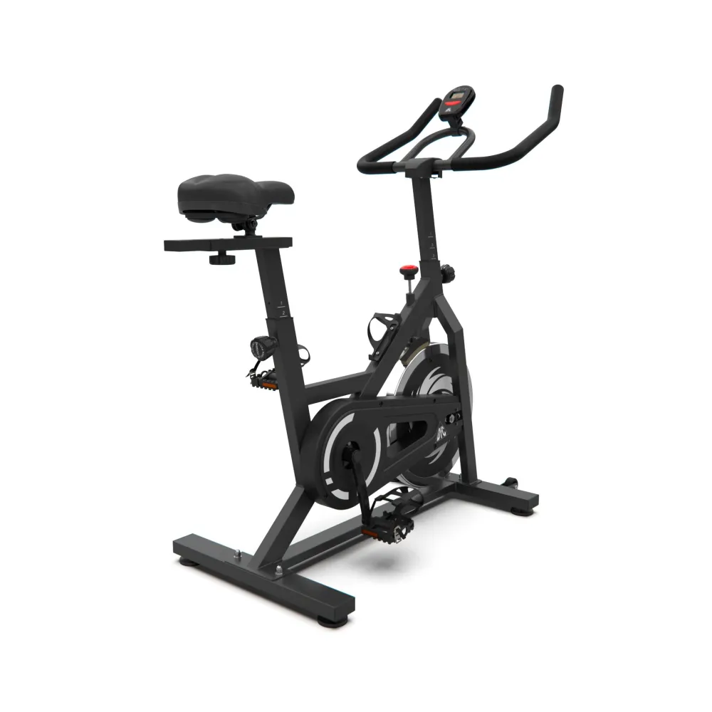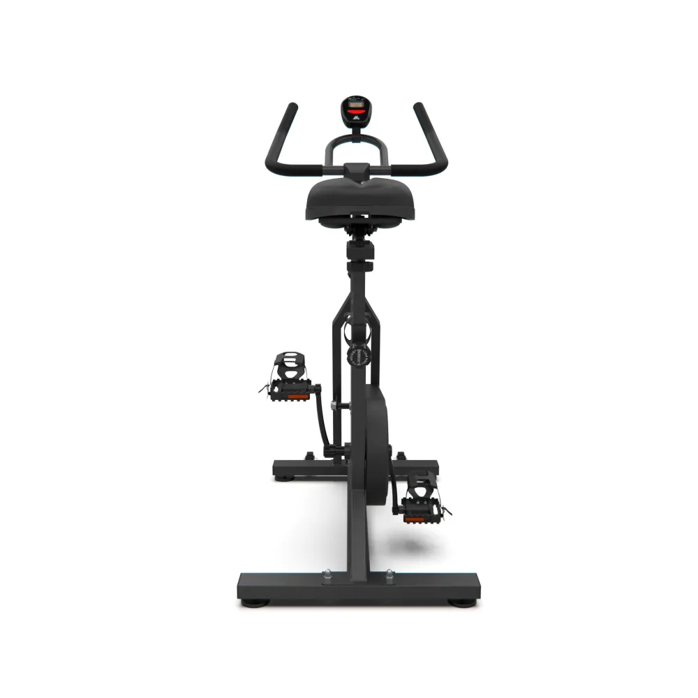 Спин-байк имеет трехкомпонентный педальный узел и размер в рабочем виде составляет 113 х 49,5 х 120 см. Монохромный LCD дисплей позволяет легко читать данные на консоли, а транспортировочные ролики и компенсаторы неровности пола обеспечивают удобство в использовании и хранении.