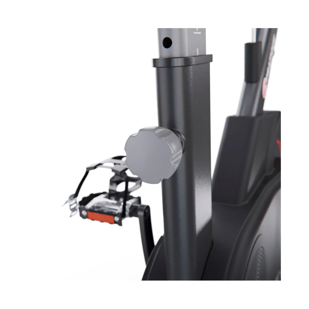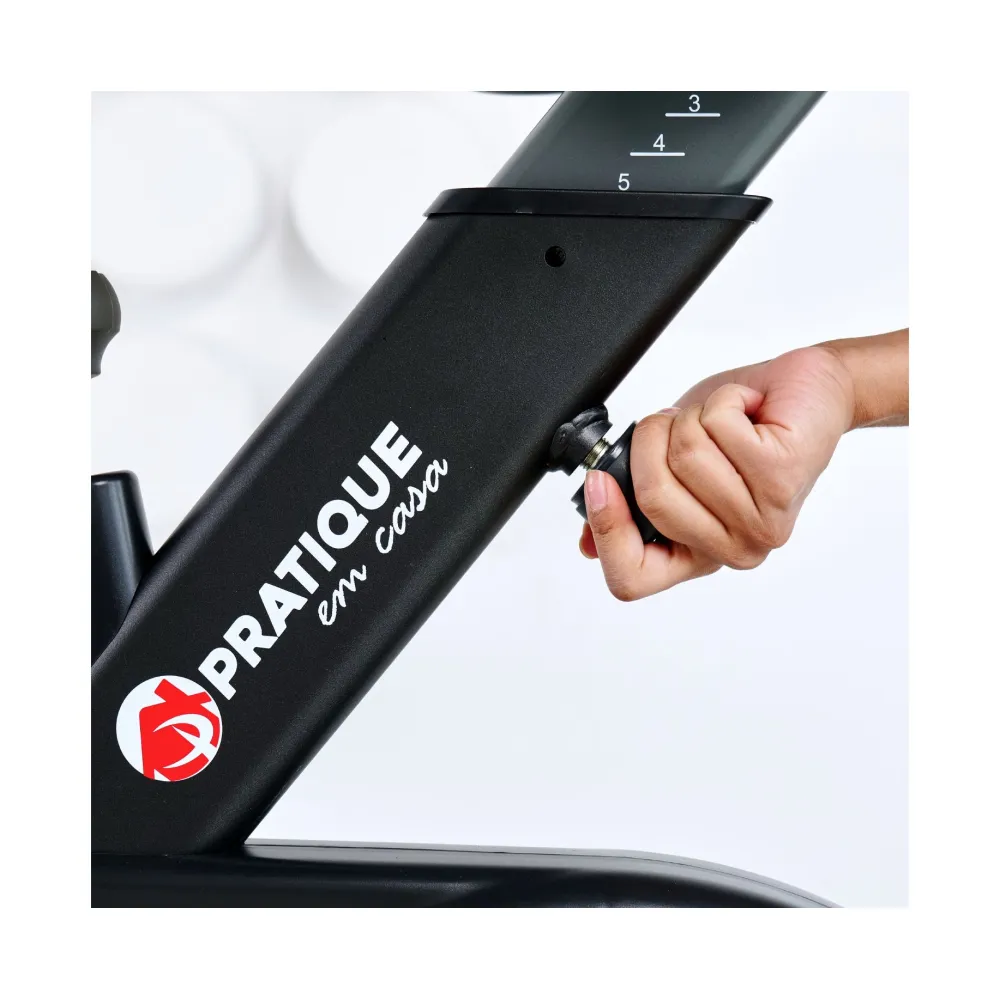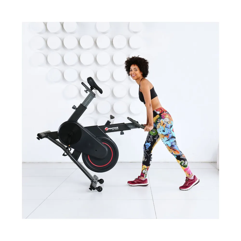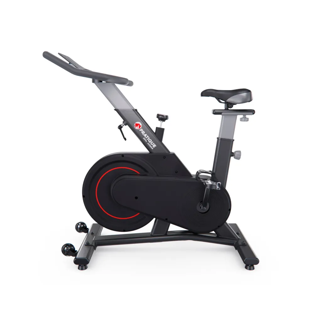 Маховик массой 15 килограмм обеспечивает плавный ход и регулировку интенсивности нагрузки. Возможность крутить педали в обе стороны добавляет разнообразия в тренировочный процесс. Ремень, обернутый вокруг маховика, обеспечивает уровень шума не более 52 дБ, делая спин-байк PRATIQUE идеальным вариантом для домашнего использования.
