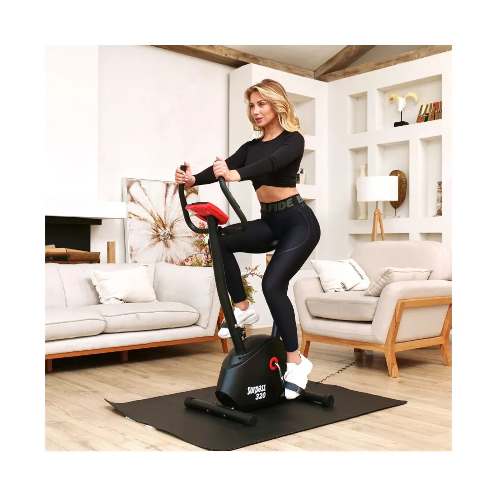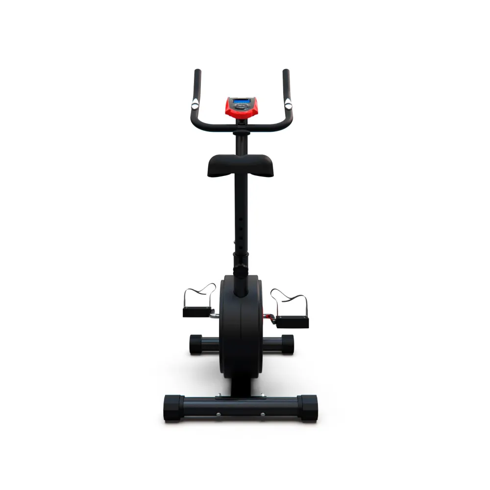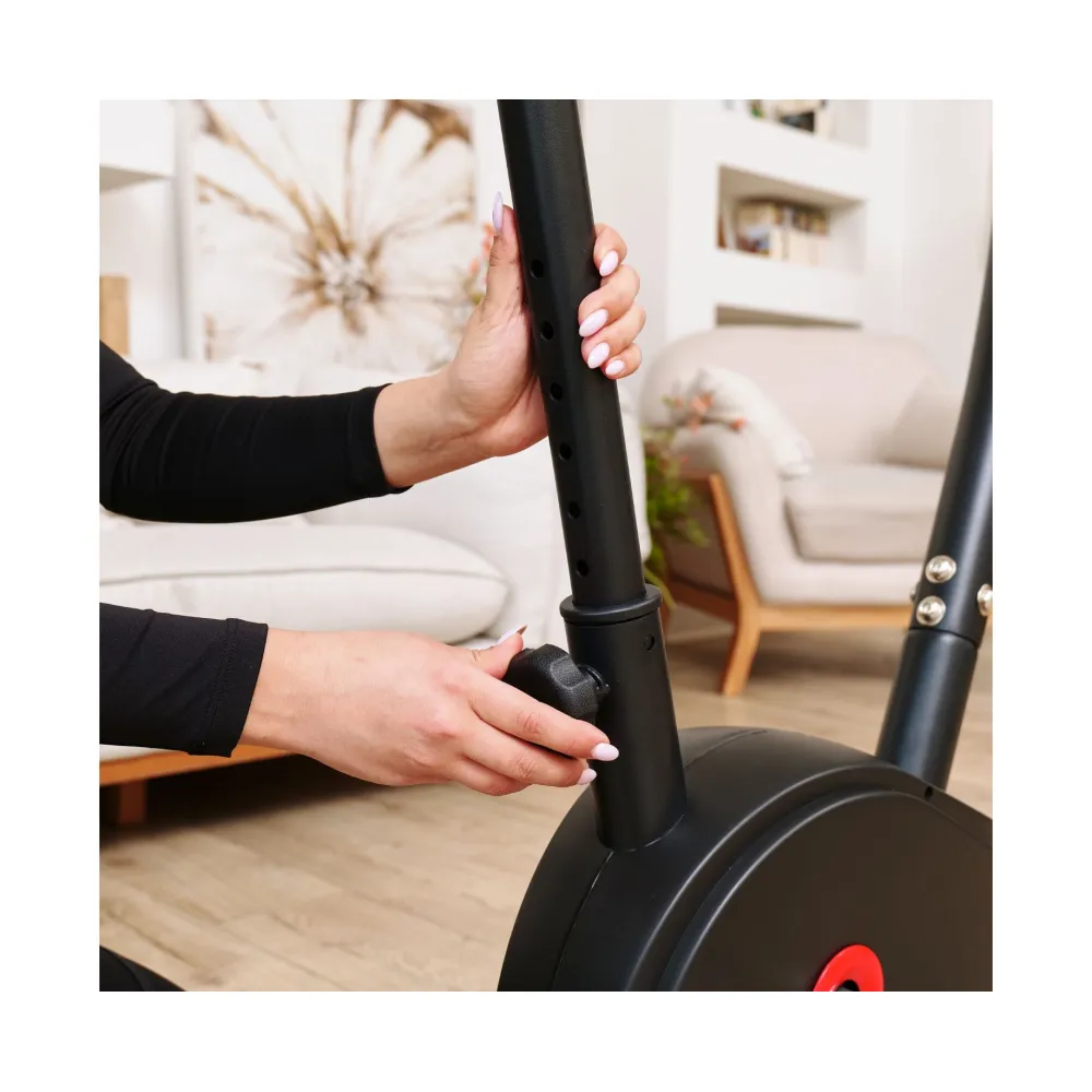 Благодаря инерционному маховику массой 6 кг с двойным направлением, пользователь может крутить педали в обе стороны. Велосипед имеет 16 уровней нагрузки, а регулировка осуществляется с помощью компьютера. Тренажер обладает 12 предустановленными программами тренировок. Адаптер идет в комплекте.