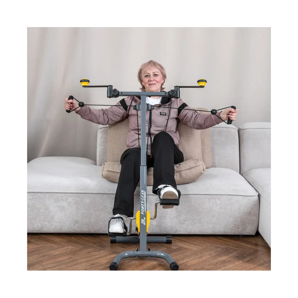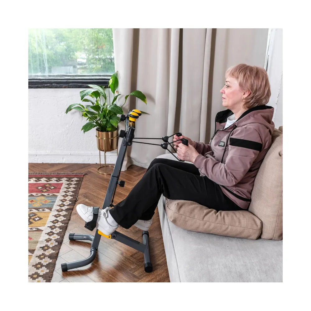 Велотренажёр двойной DFC B810W с накладками и ручками ярко-жёлтого цвета для домашнего использования. Многофункциональная модель позволяет тренировать как руки, так и ноги одновременно или врозь. Для разнообразия тренировок в комплекте поставляются эспандеры.