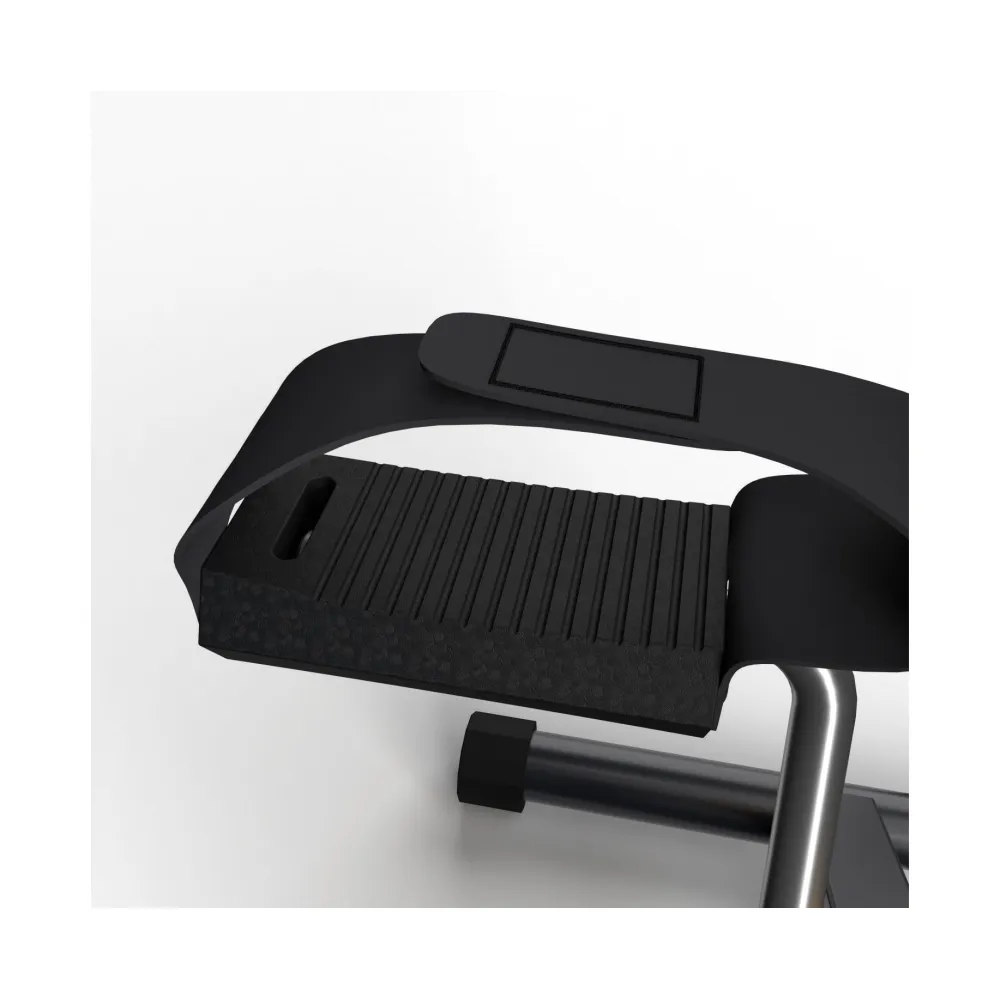 Конструкция велотренажёра складная. Педали с регулируемыми ремешками на липучках. На ножках расположены резиновые накладки для защиты от скольжения и царапания поверхности пола, а также компенсаторы неровности пола.