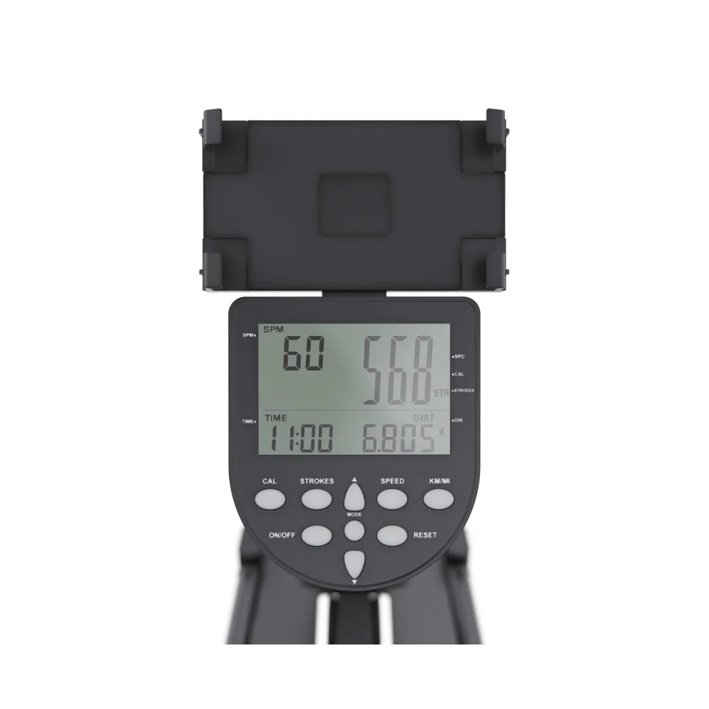 Тренажёр оснащён монохромным LCD-дисплеем, отображающим ключевые показатели тренировки — калории, дистанцию, скорость и общее количество гребков. Для расширения функционала предусмотрено подключение по Bluetooth к приложениям FITLOG и KINOMAP, что позволяет отслеживать прогресс и делать занятия более увлекательными. В комплект входят две батарейки типа AA, необходимые для работы дисплея.