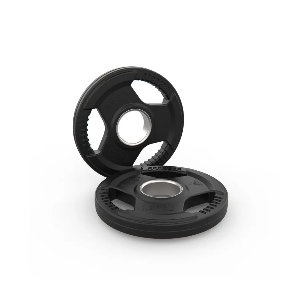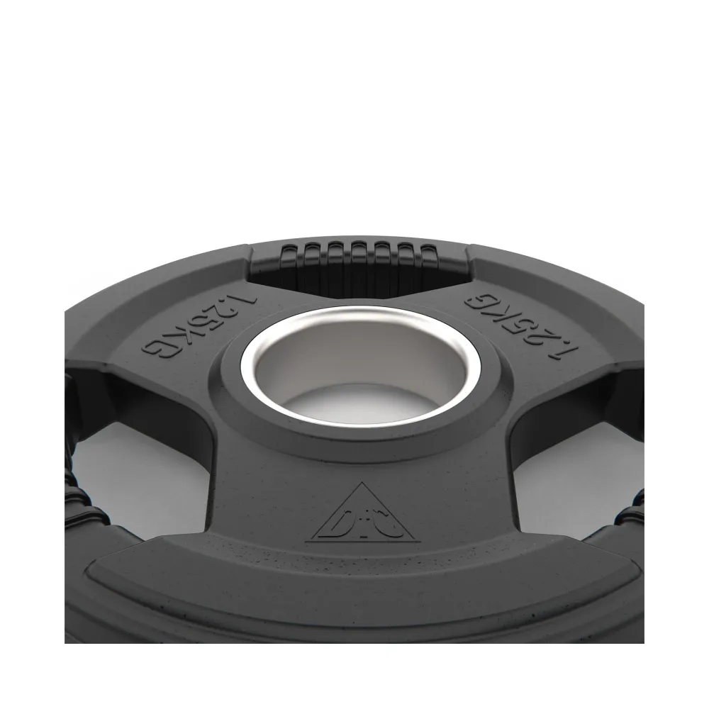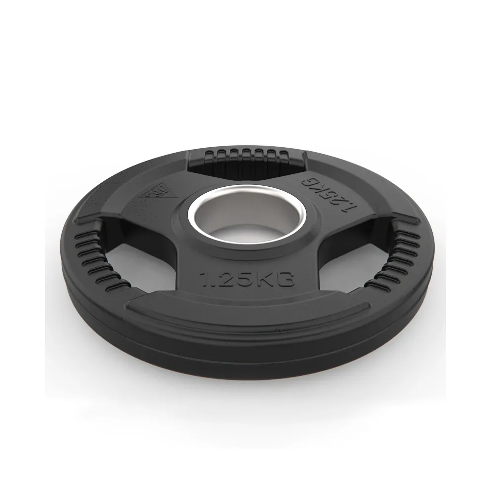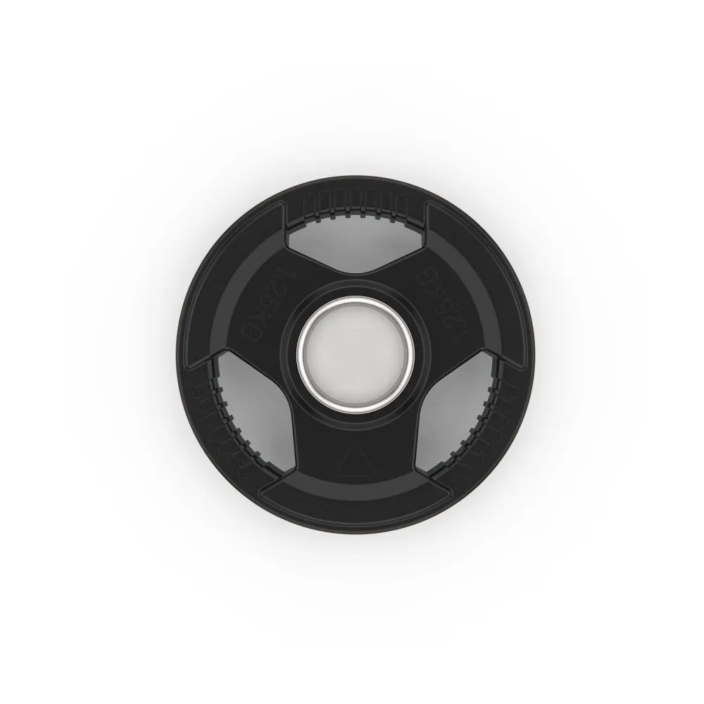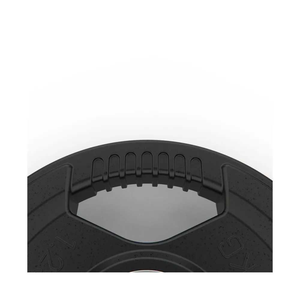 Форма диска продумана так, что он оснащен тремя ручками для хвата, что позволяет удобно его удерживать с разных сторон. Обрезиненная поверхность предотвращает повреждение пола при падении, что особенно важно для залов фитнеса и бодибилдинга.