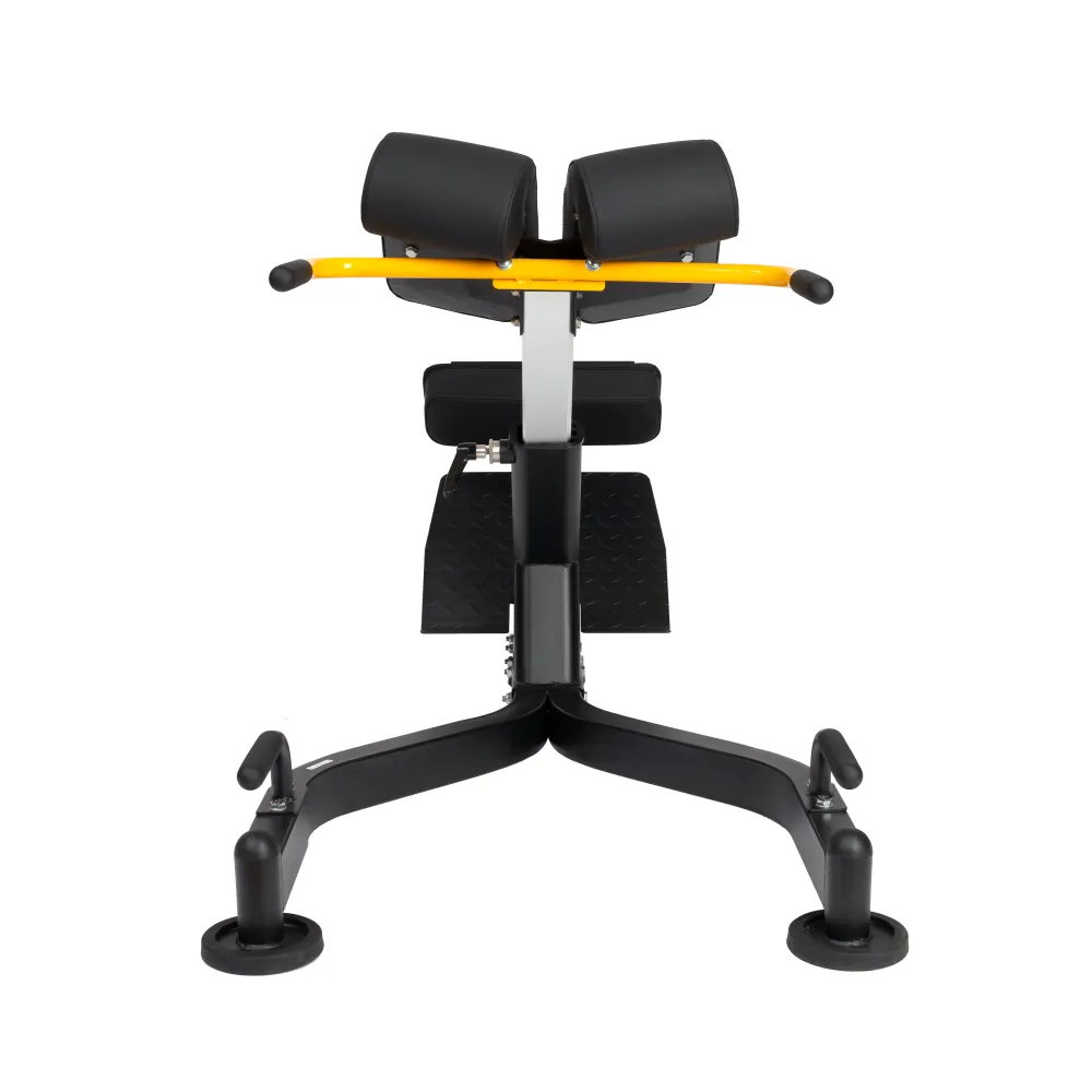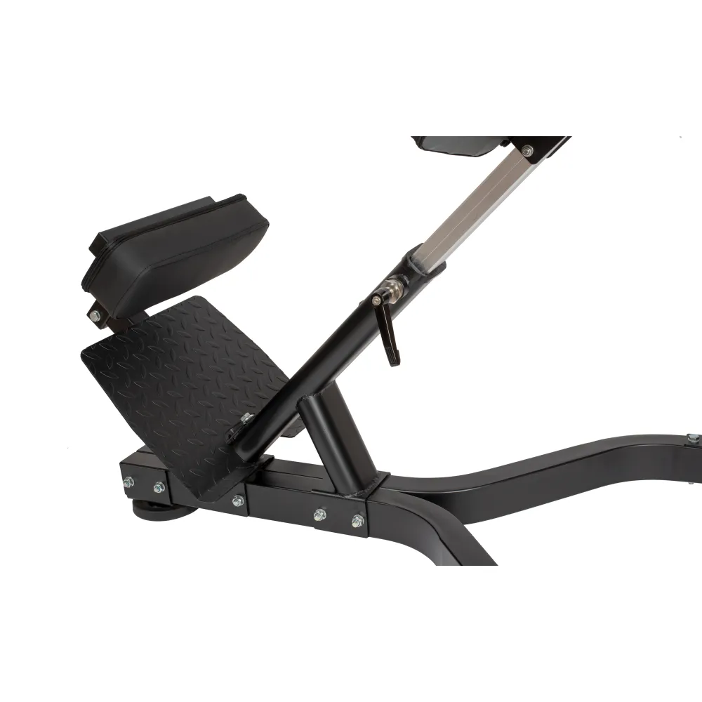 У этого тренажера опорные подушки повышенной плотности, которые расположены под оптимальным углом. Плавная регулировка высоты позволяет настраивать гиперэкстензию для пользователей разного роста. Также предусмотрена широкая подушка-фиксатор для ног, что обеспечивает комфорт во время тренировок.