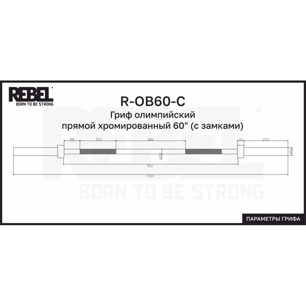 Олимпийский прямой гриф хромированный длиной 60 дюймов от бренда REBEL (модель R-OB60-C) предназначен как для использования в коммерческих залах, так и для домашних тренировок. Он оснащён качественными латунными втулками, которые обеспечивают долговечность и надёжность в эксплуатации.