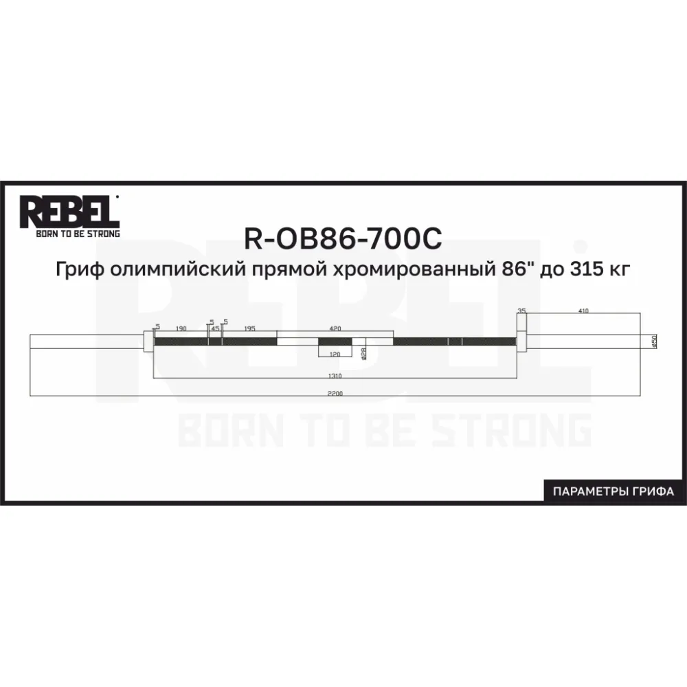 Гриф олимпийский прямой хромированный REBEL R-OB86-700C длиной 86 дюймов (220 см) идеально подходит как для коммерческих тренажерных залов, так и для индивидуальных занятий дома. Этот гриф полностью соответствует олимпийским стандартам, что гарантирует его высокую надежность и долговечность.