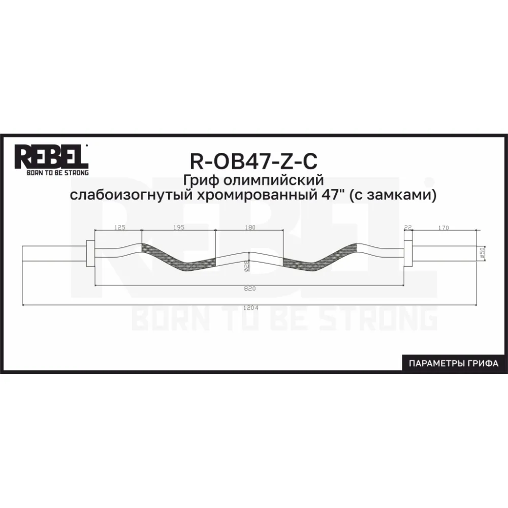 Гриф олимпийский с слабоизогнутой формой, модель REBEL R-OB47-Z-C, имеет хромированное покрытие и поставляется вместе с пружинными замками FT-OC51-SRR. Он предназначен для использования в силовых тренировках и отлично подходит как для новичков, так и для опытных спортсменов.