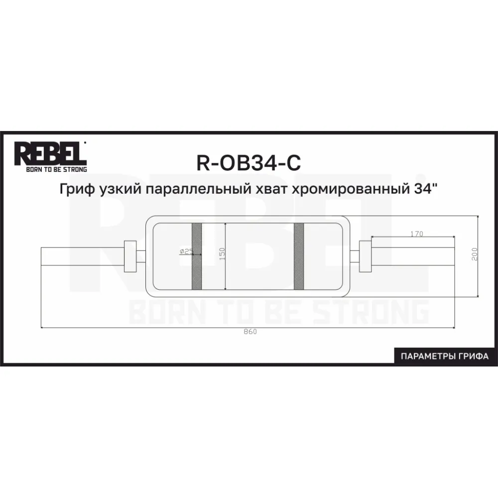 Гриф узкий параллельный хват хромированный 34" REBEL R-OB34-С выполнен из высокопрочной стали. Он сочетает в себе надежность и долговечность, что делает его отличным выбором как для коммерческих тренажерных залов, так и для домашнего использования.
