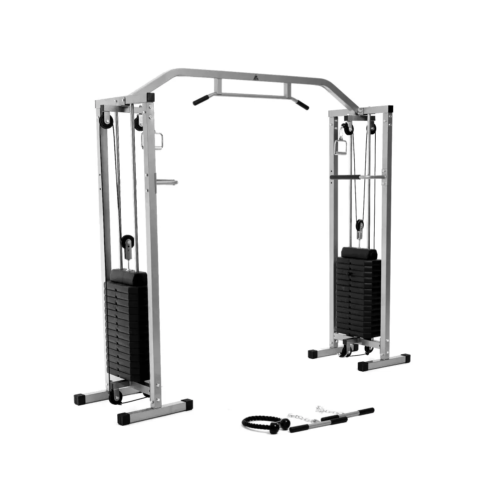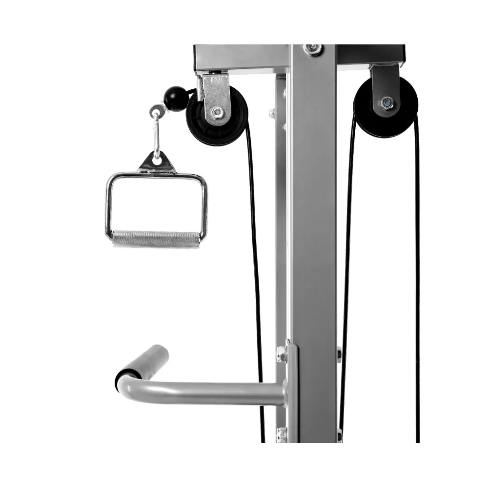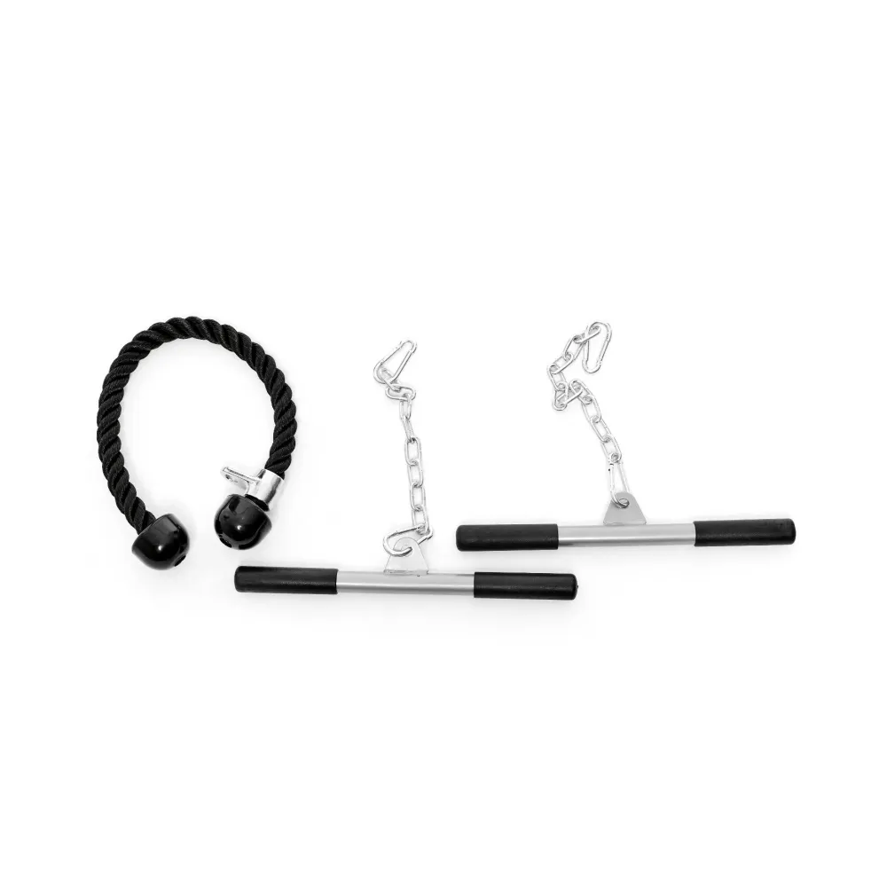 В комплектацию входит канат для упражнений на трицепс и бицепс (сгибания, разгибания рук), мышцы плеч и кора (упражнение «священник»). Он крепится к регулируемой по высоте каретке.