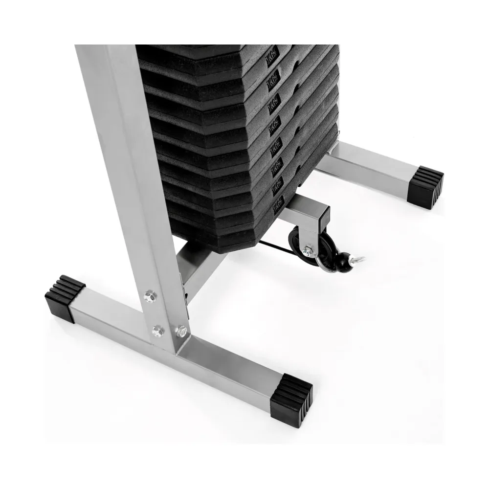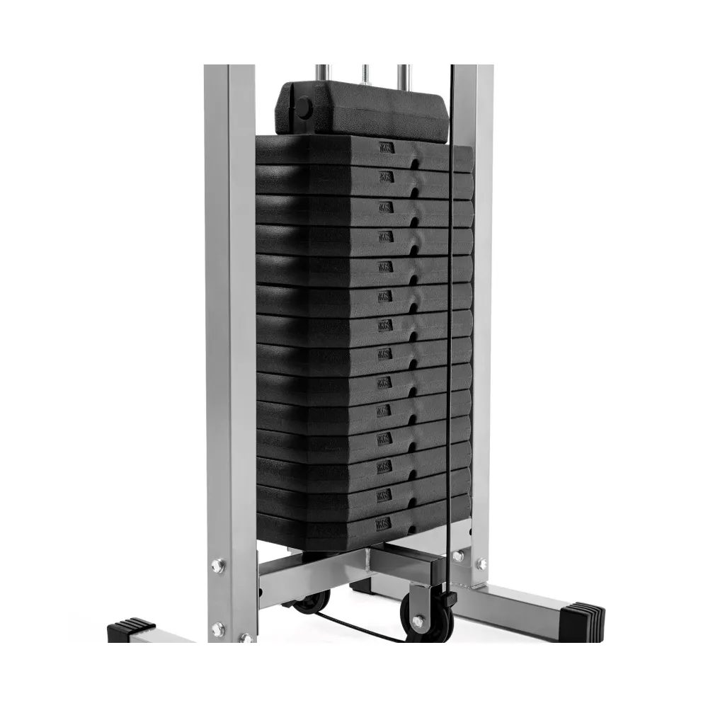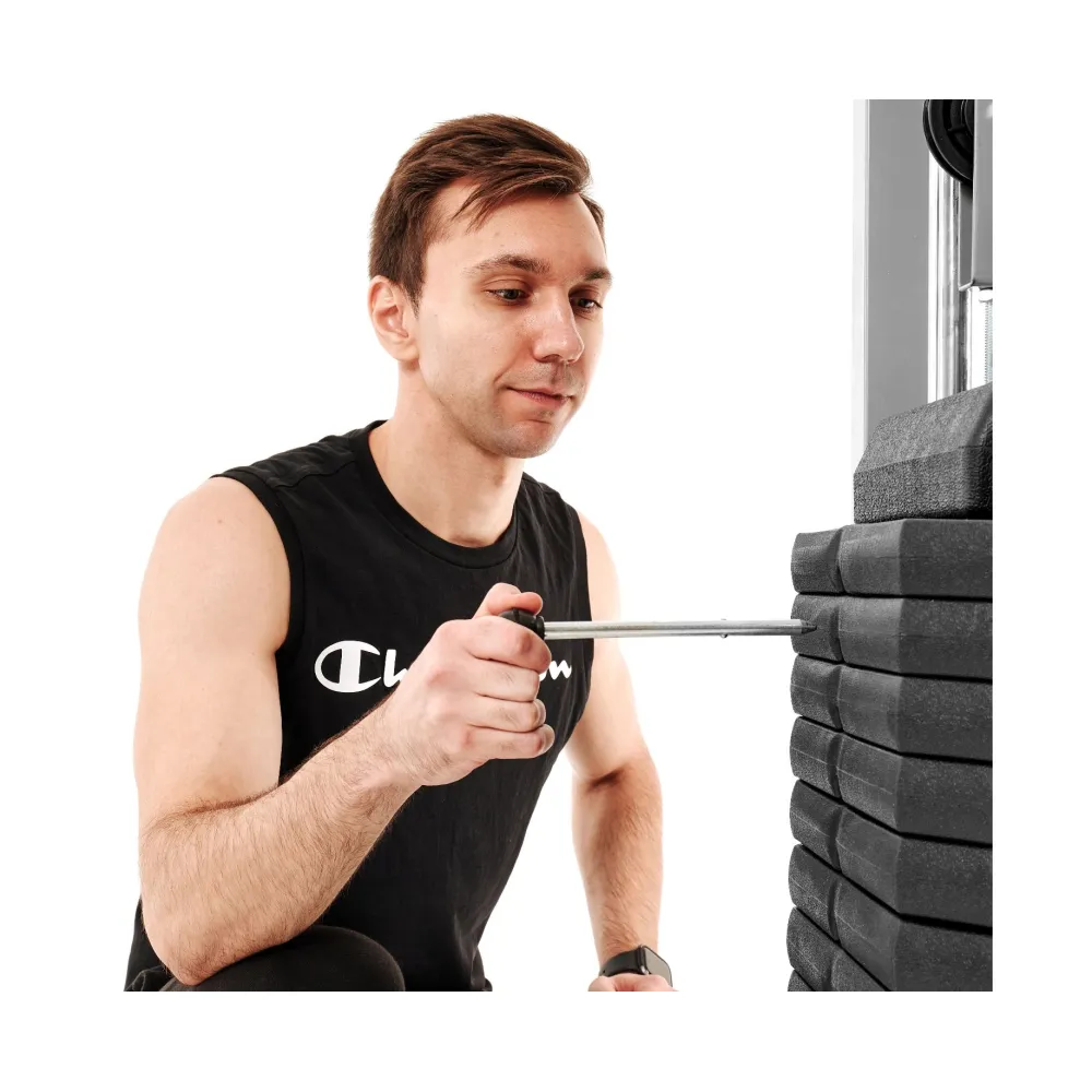 В комплект входит турник для подтягиваний, который позволяет выполнять упражнения широким хватом. В качестве нагрузки используются встроенные стеки общим весом 150 кг (2 по 75 кг).