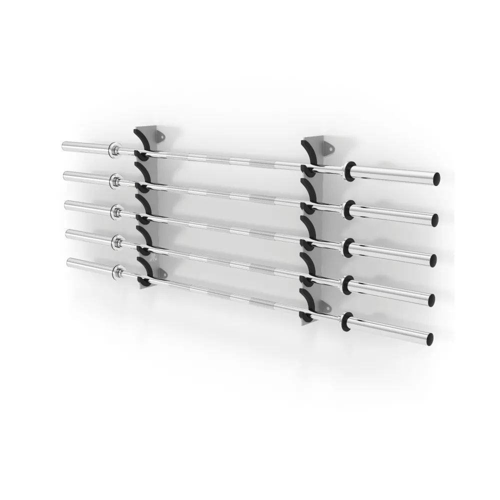 Максимальная нагрузка на стойку составляет до 300 кг. Она вмещает до 7 грифов с диаметром 30 мм. Держатели надежно крепятся к стене с помощью высокопрочных стальных болтов, что обеспечивает их устойчивость и долговечность.