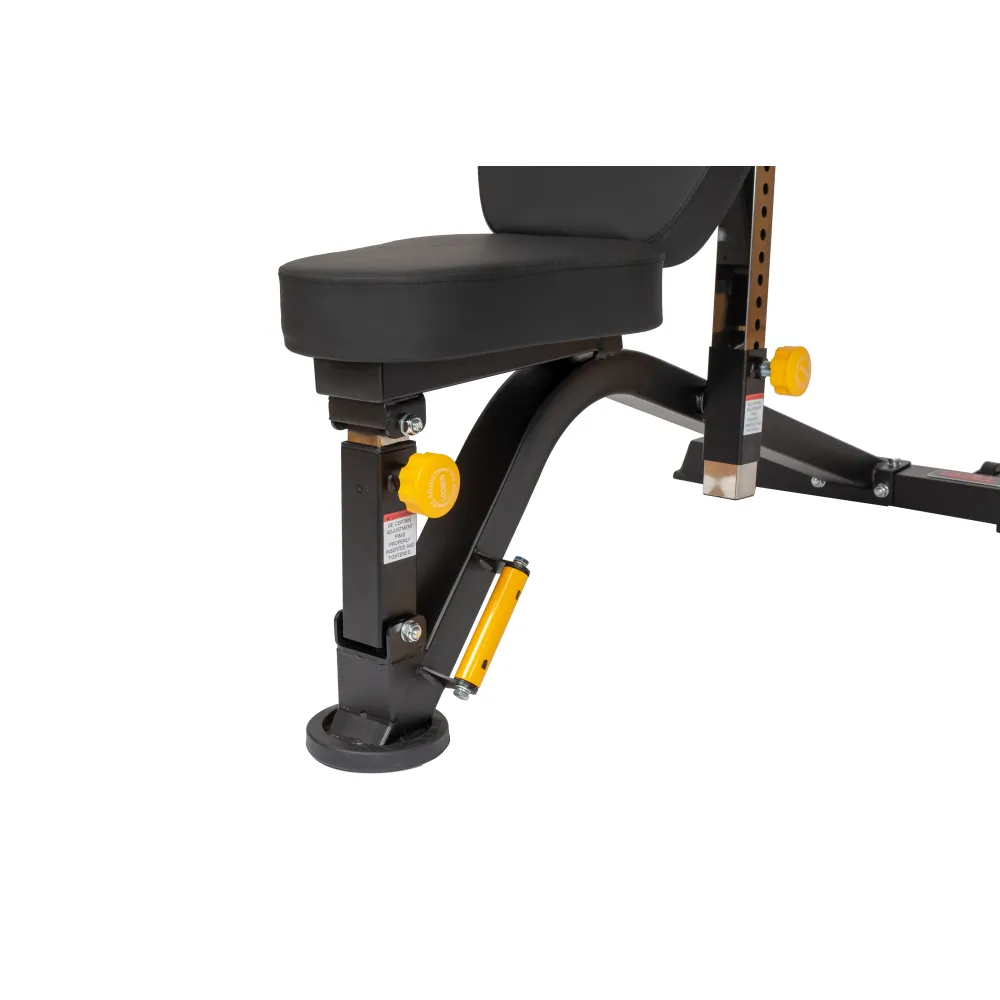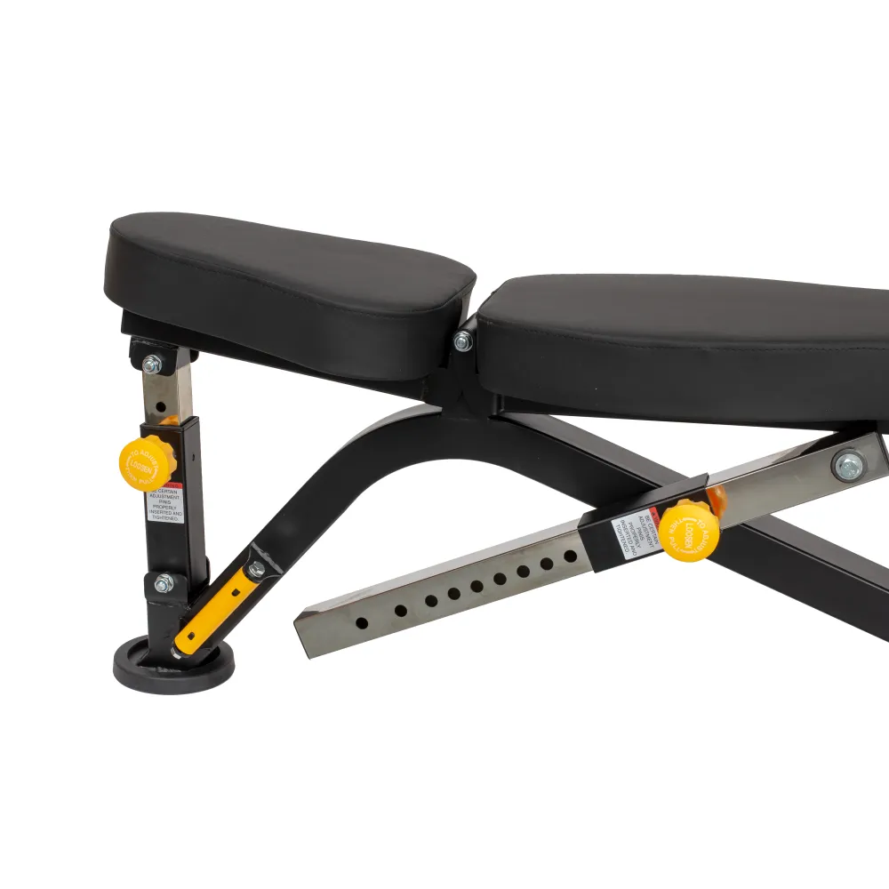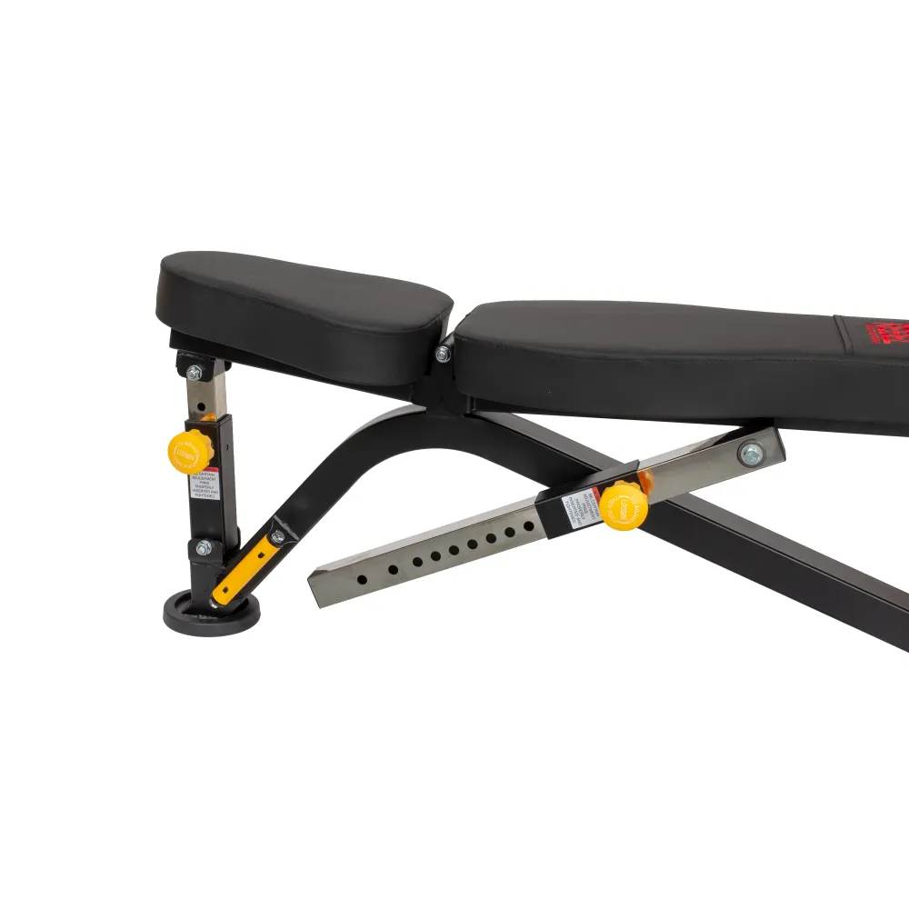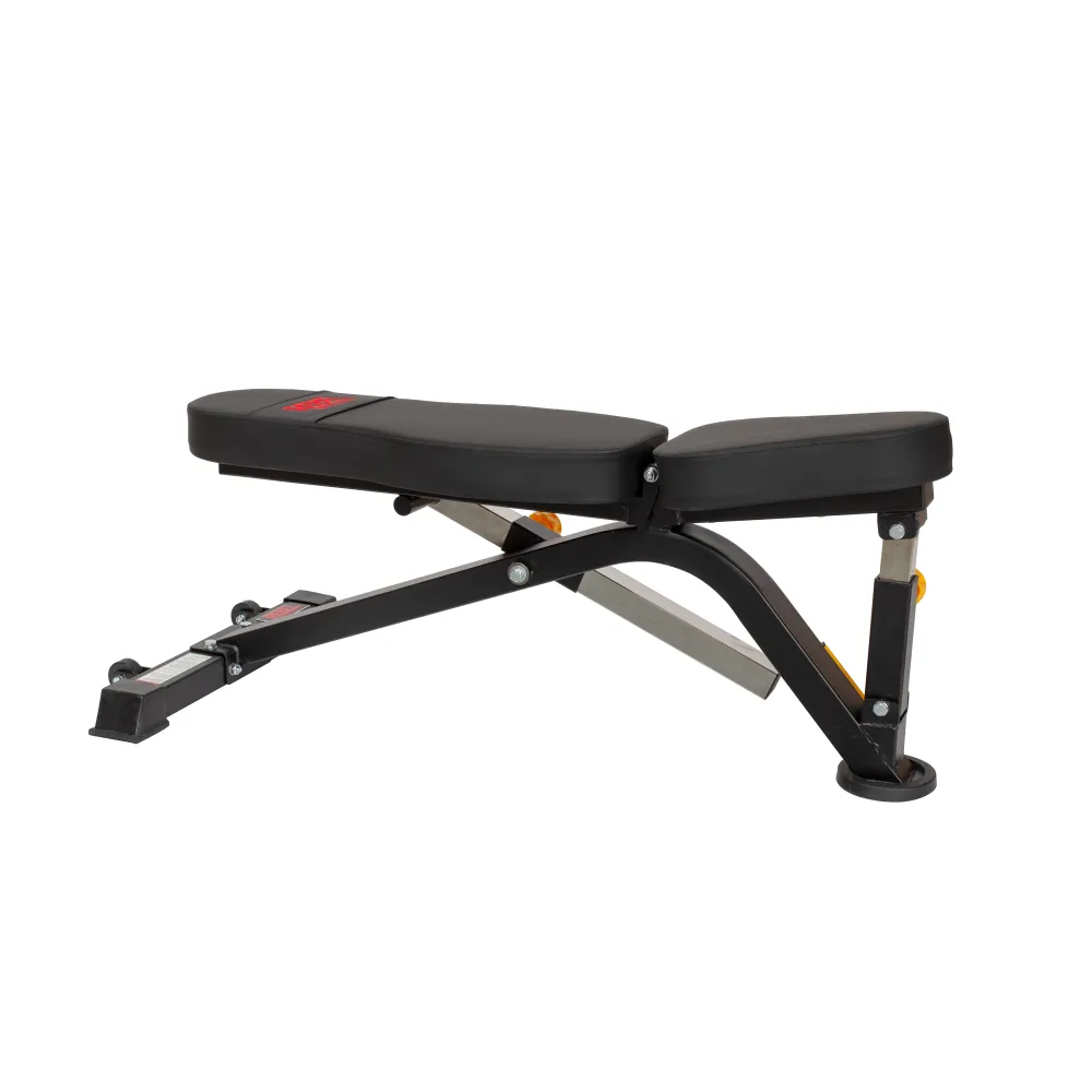 Подушки скамьи заполнены высокопрочным поролоном вторичного вспенивания (ПВВ). Среди особенностей можно выделить широкие подушки спинки и сиденья, а также 13 фиксированных положений для регулировки угла наклона спинки (положительный, нулевой, отрицательный) и 4 фиксированных положения для сидения. Удобные регулировочные элементы и ручка с транспортировочными колесами обеспечивают легкость перемещения, а прорезиненные накладки на ножках предотвращают скольжение.
